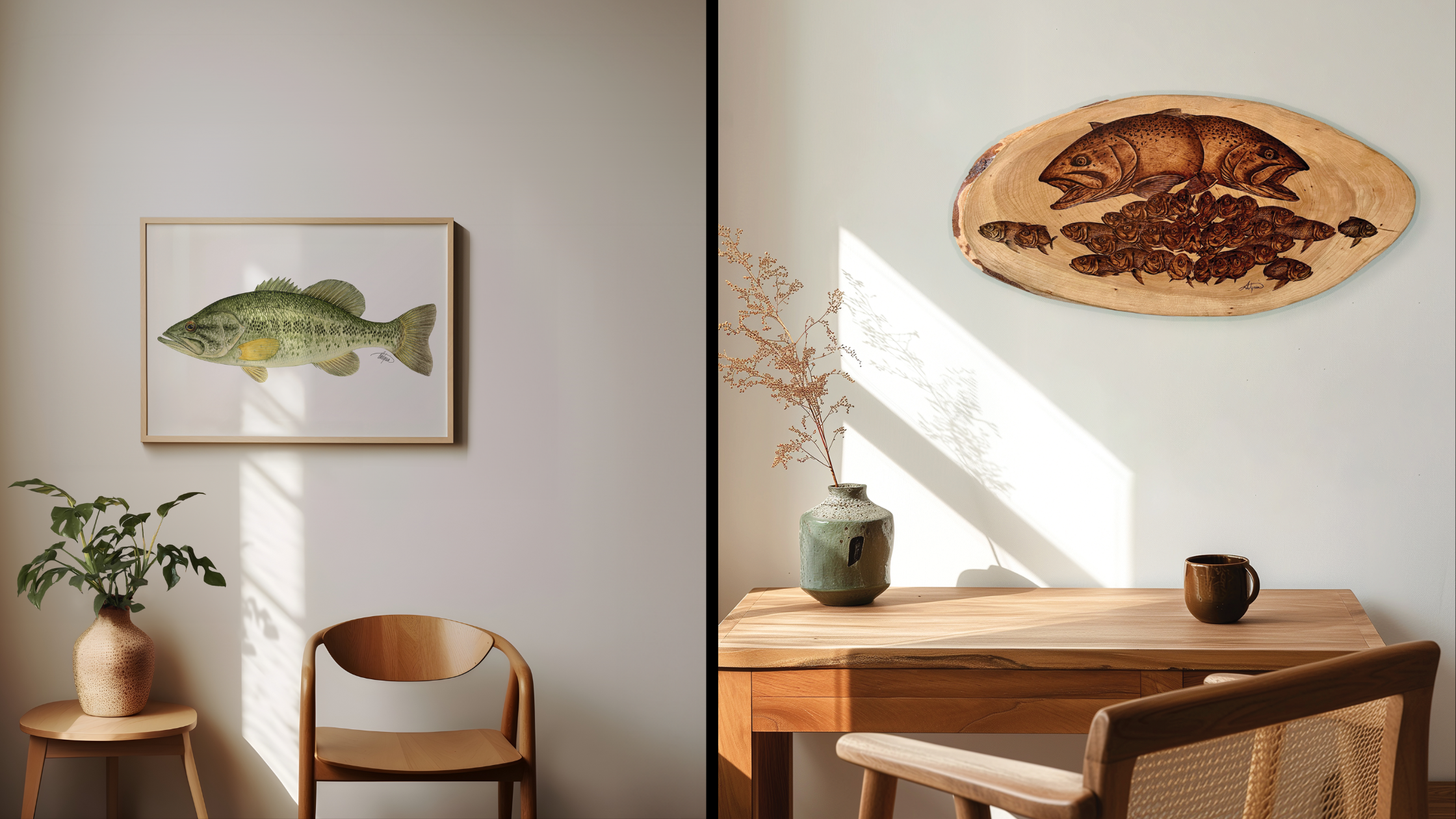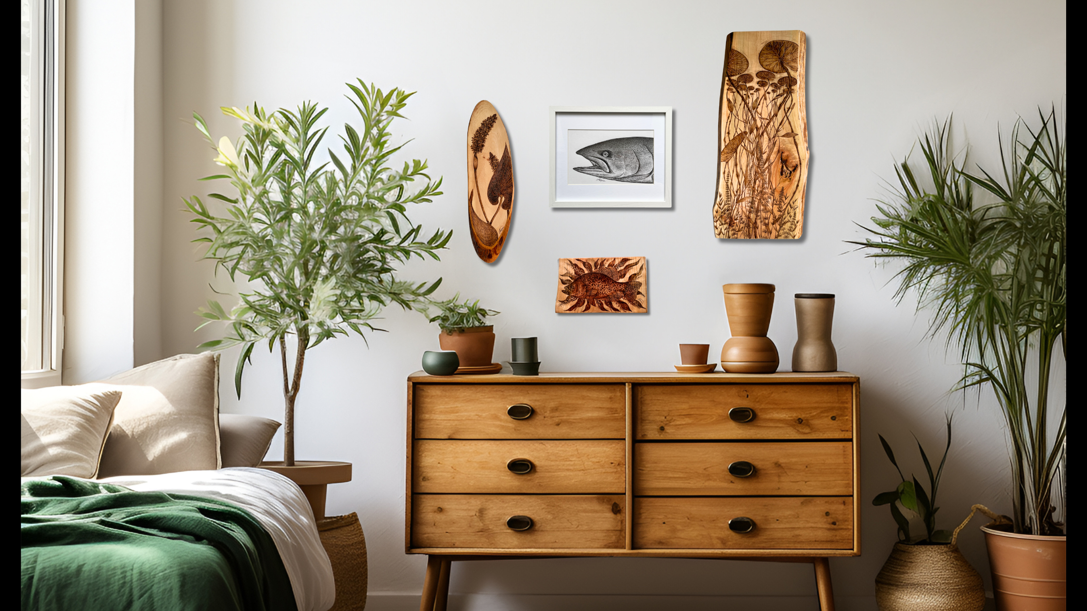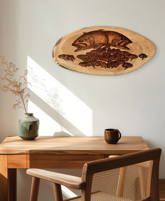 Woodburnings and watercolour paintings inspired by the flora and fauna of Canada's inland lakes, rivers and wetlands.