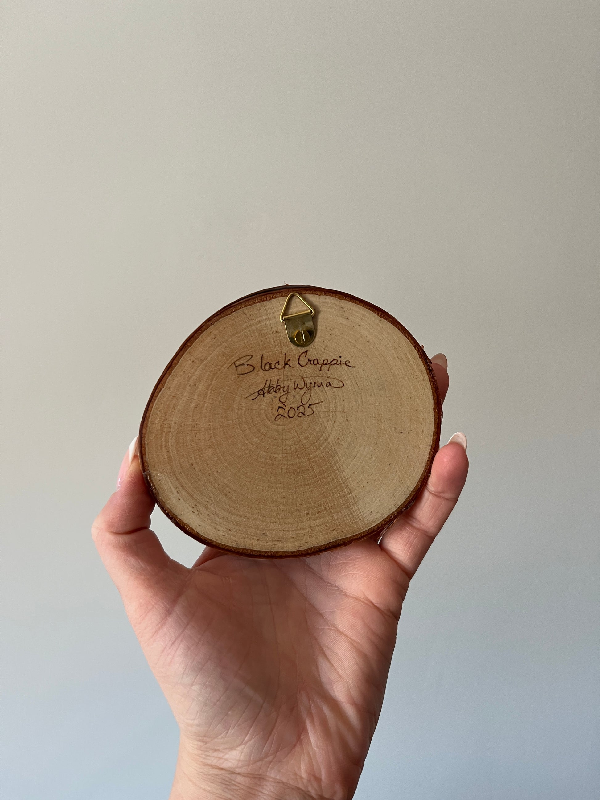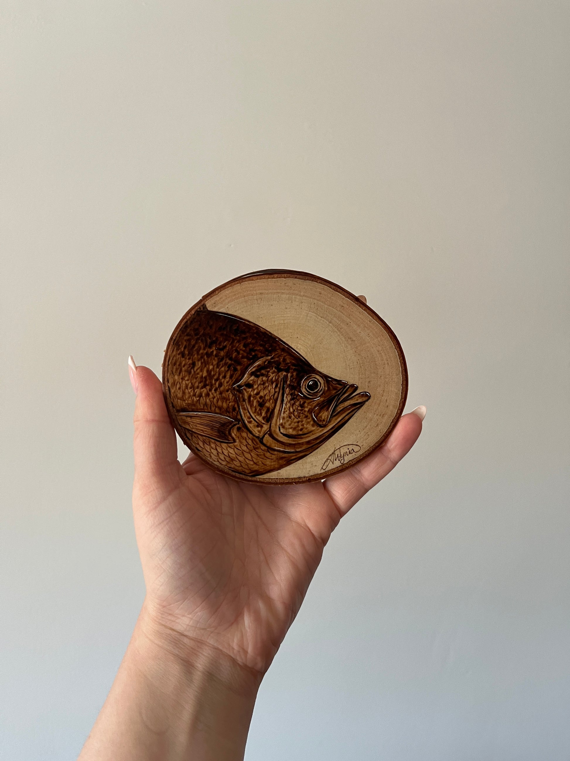Hand burnt on birch, this 4” piece comes with a varathane finish and a small D-ring hanger installed on the back.
