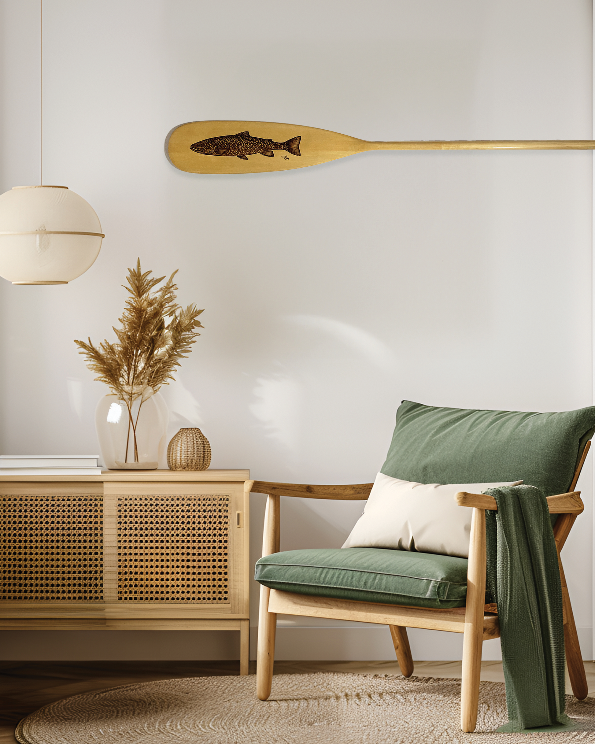 Hand burned on a 57" laminated aspen paddle, this piece features a brook trout portrait.