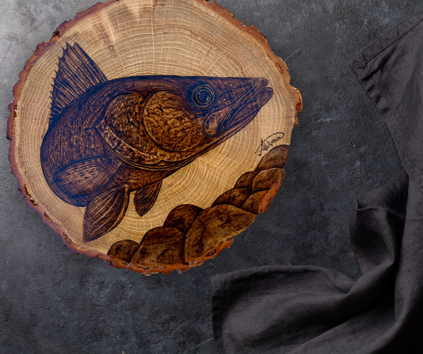 Dunvegan is an original, one-of-one, hand burned piece by Abby Wynia. The piece features a swimming walleye, tucked close to the cobble substrate along the bottom of the river