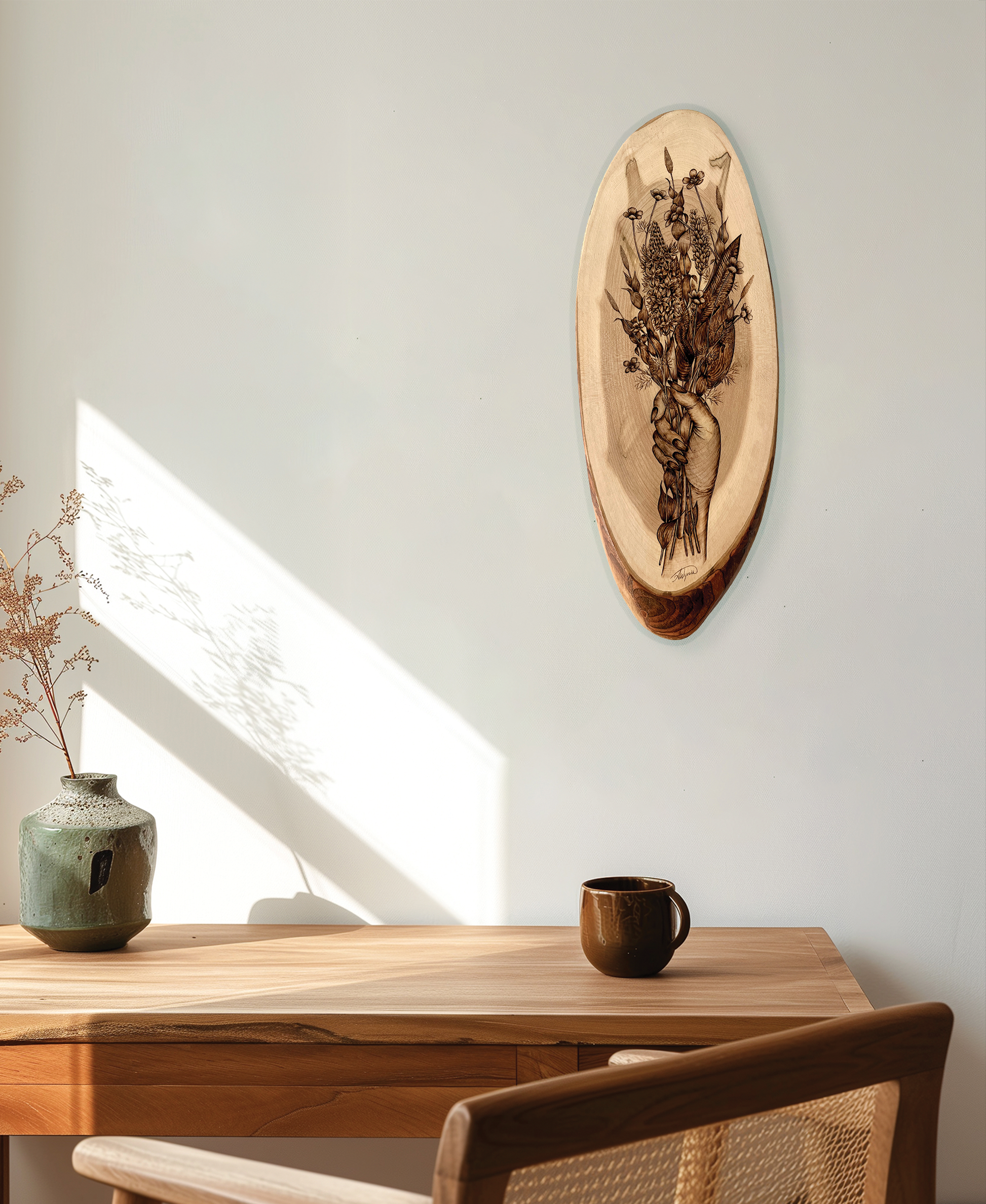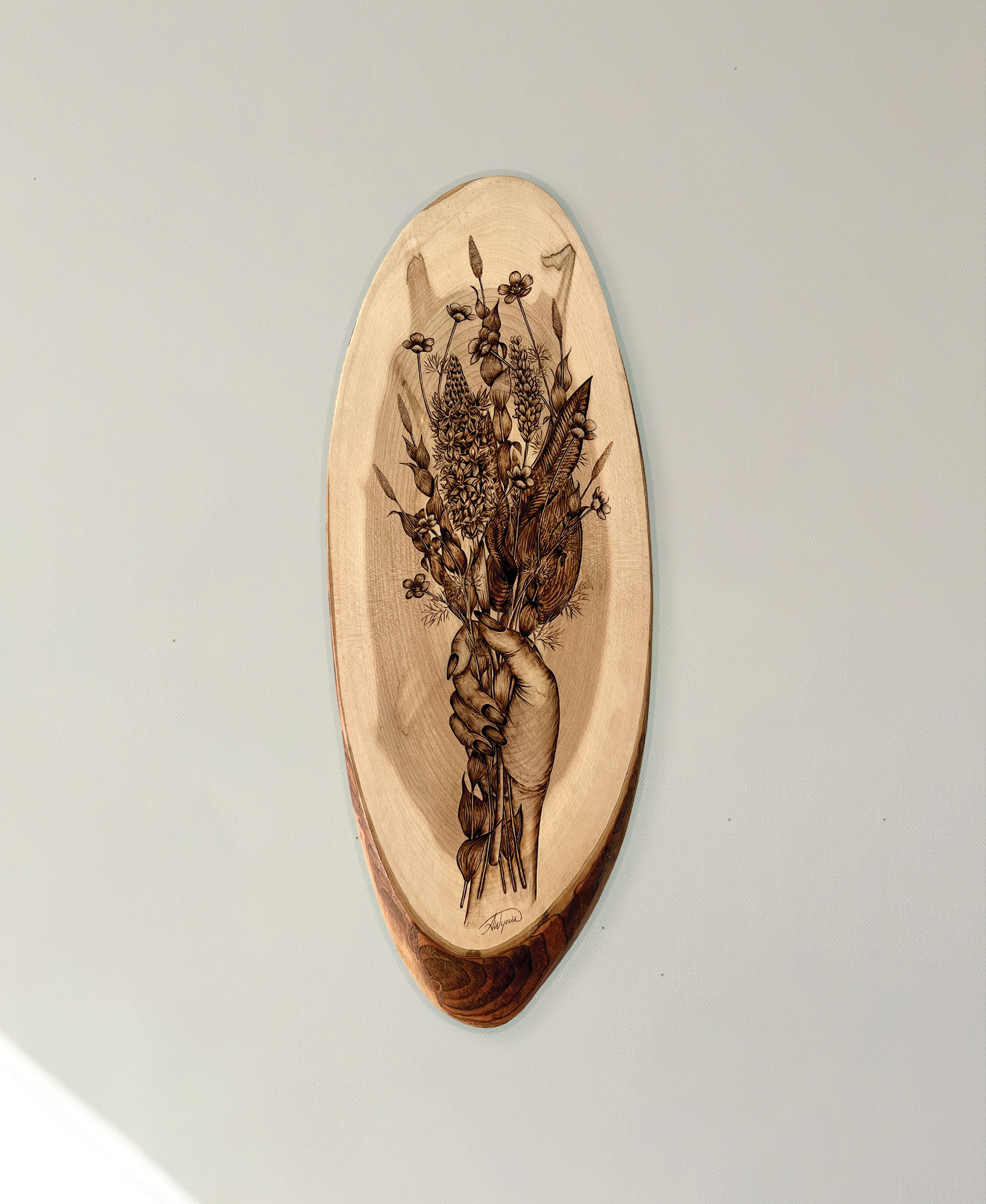 Hand-burnt on bias cut maple, Mother of Bog features a woman's hand grasping a bouquet of flowering aquatic plants. A tribute to time spent in these wild and wonderful places full of beauty yet often overlooked.