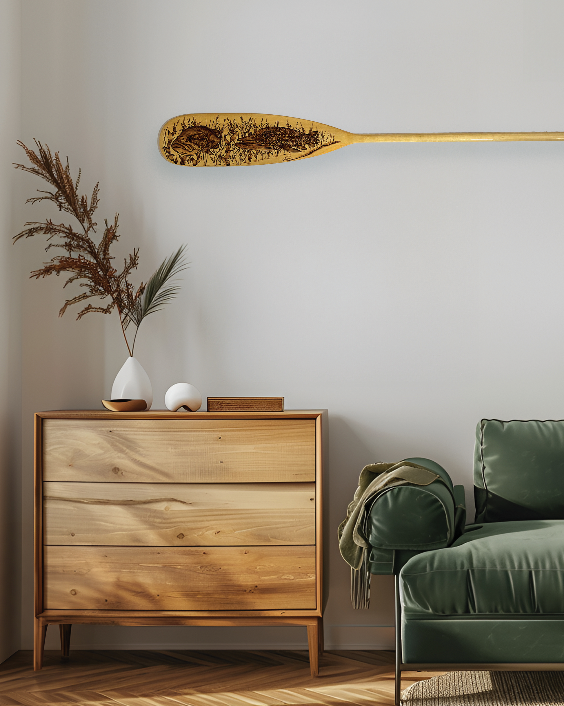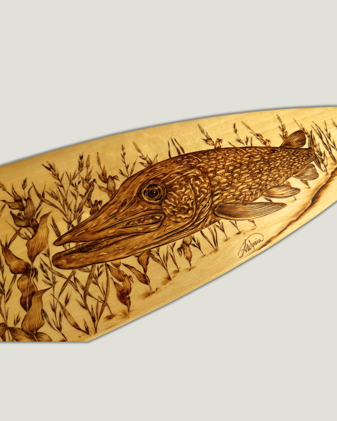 Hand burned on a 57" laminated aspen paddle, this piece features a northern pike chasing a smallmouth bass around a bed of vegetation.