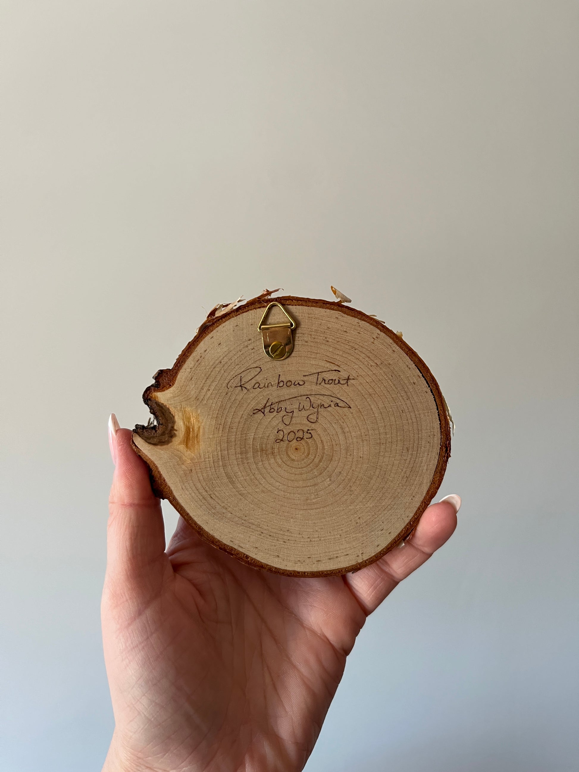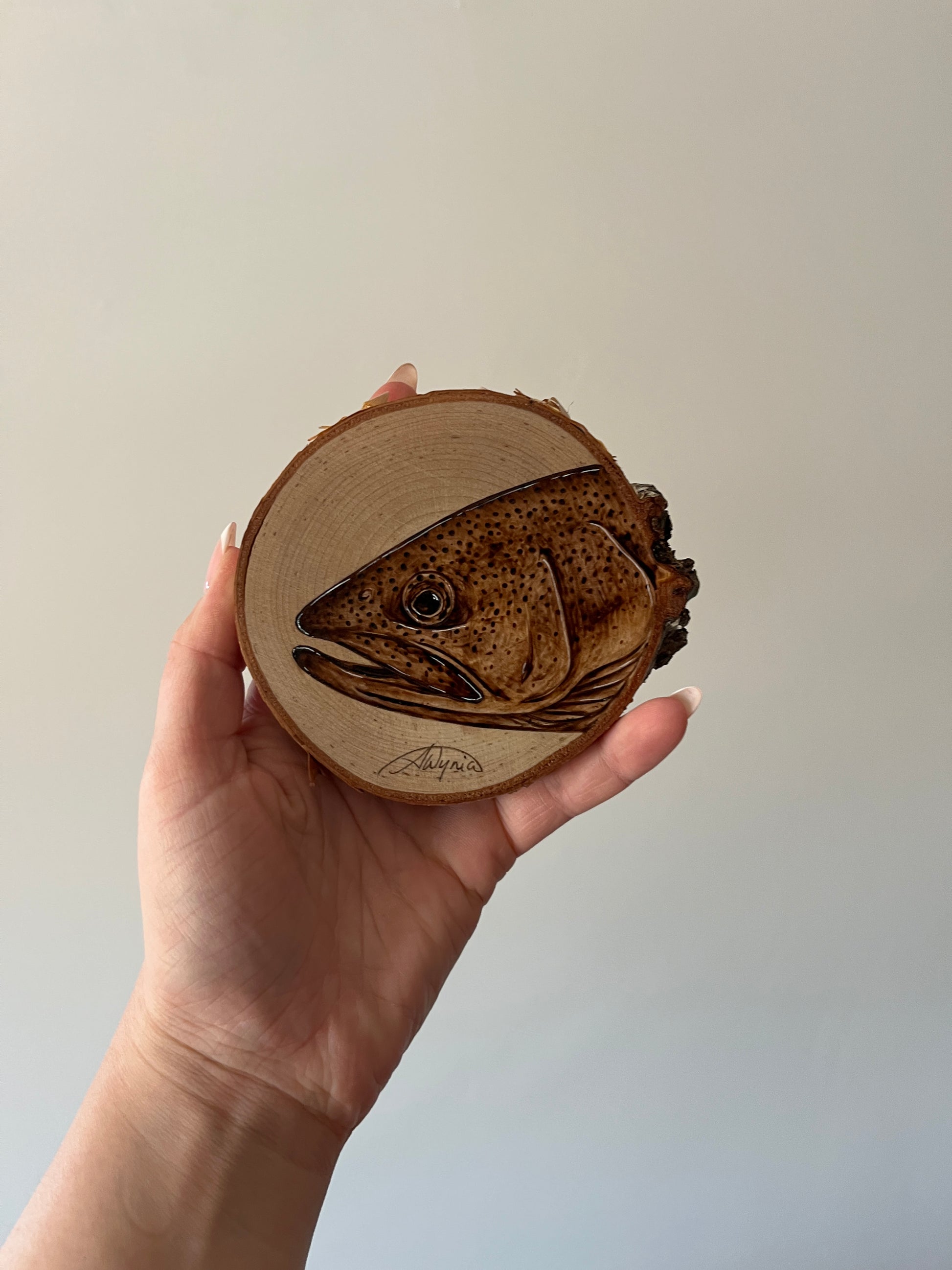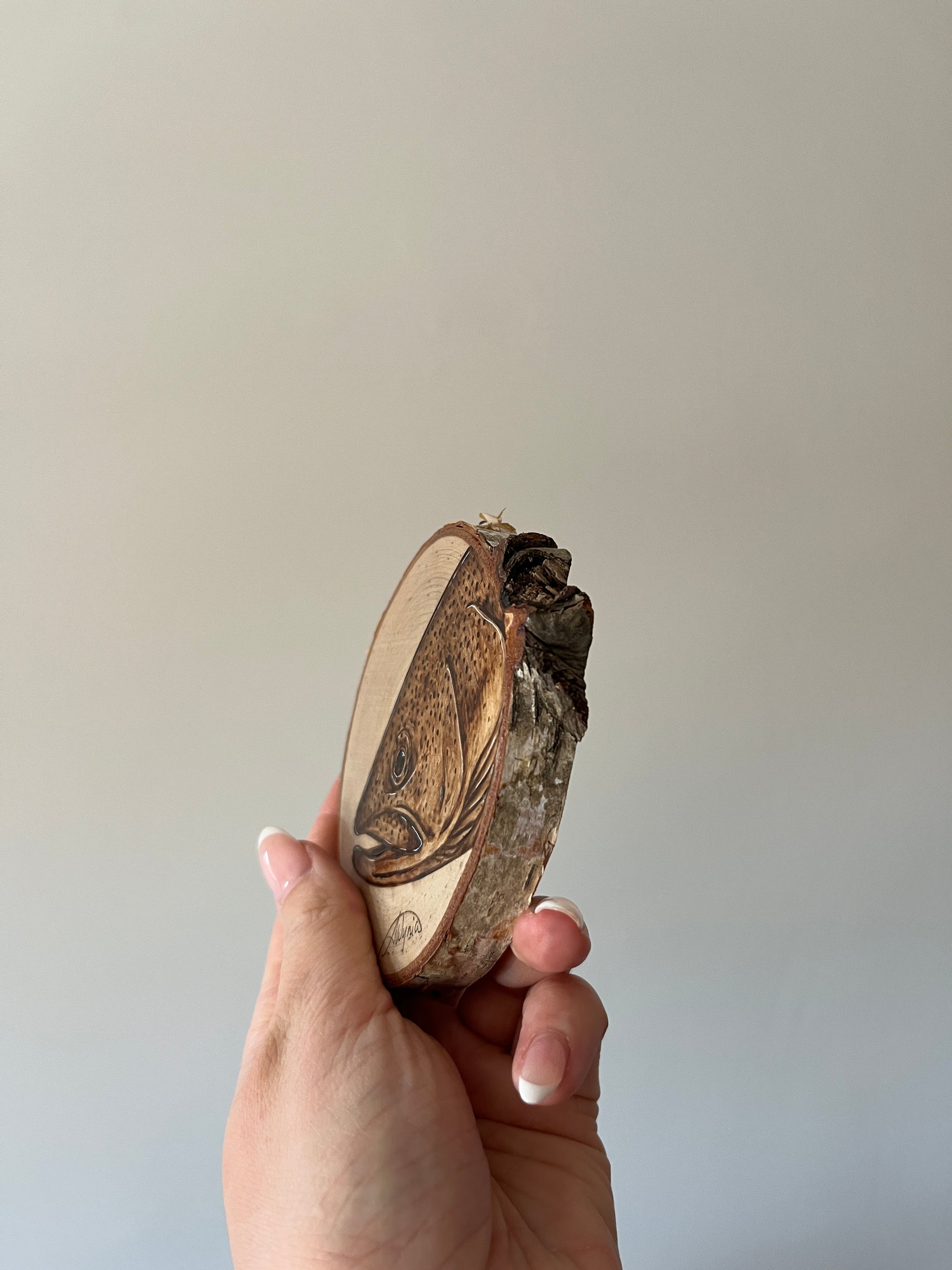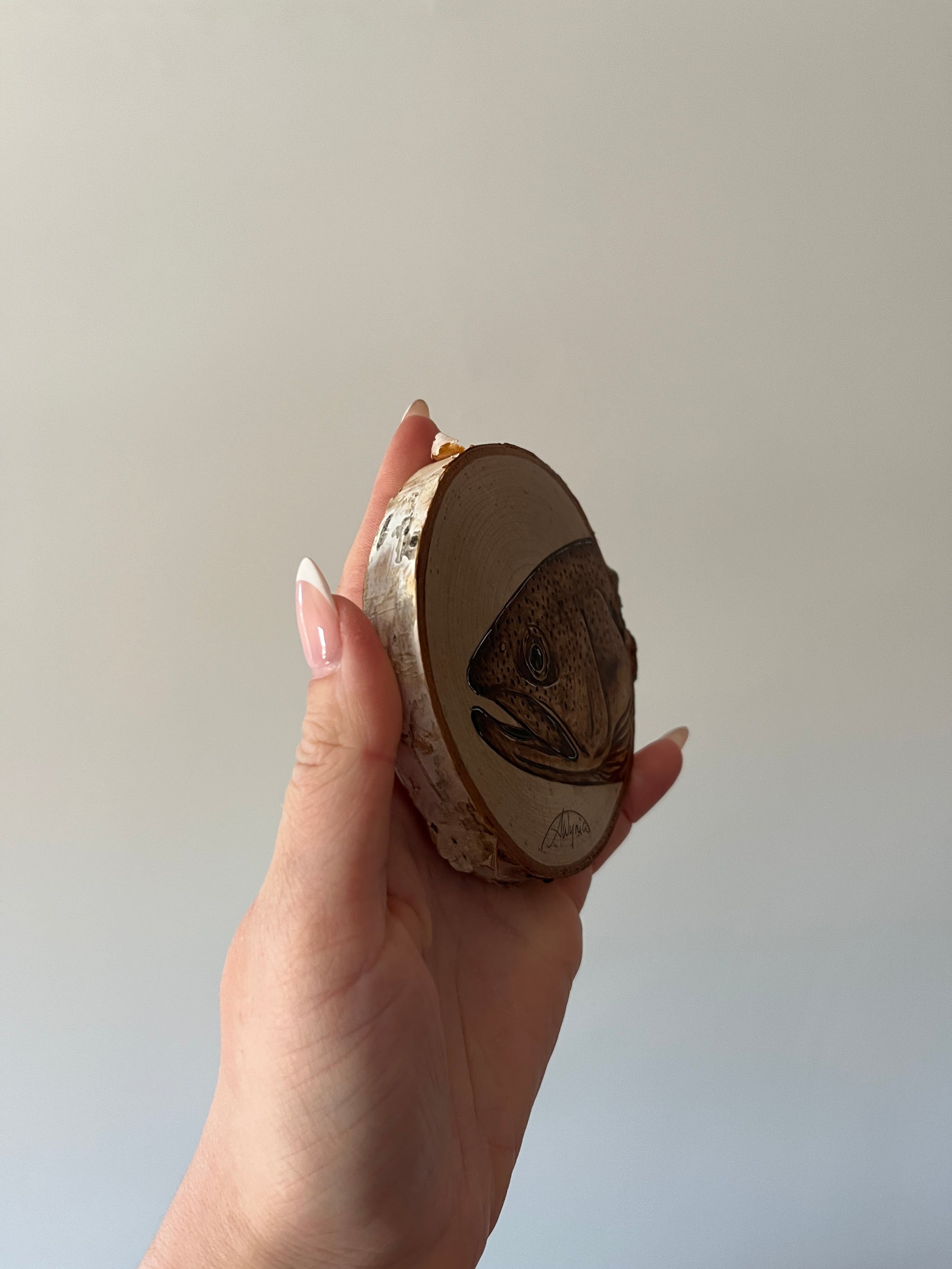Hand burnt on birch, this 4” piece comes with a varathane finish and a small D-ring hanger installed on the back.
