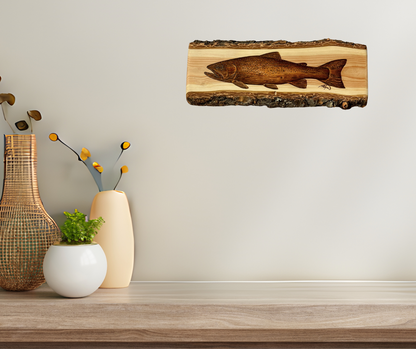 This is an original, one-of-one, hand burned piece by Abby Wynia, featuring a side profile portrait of a rainbow trout. This is one of three pieces completed on a matching set of douglas fir planks.