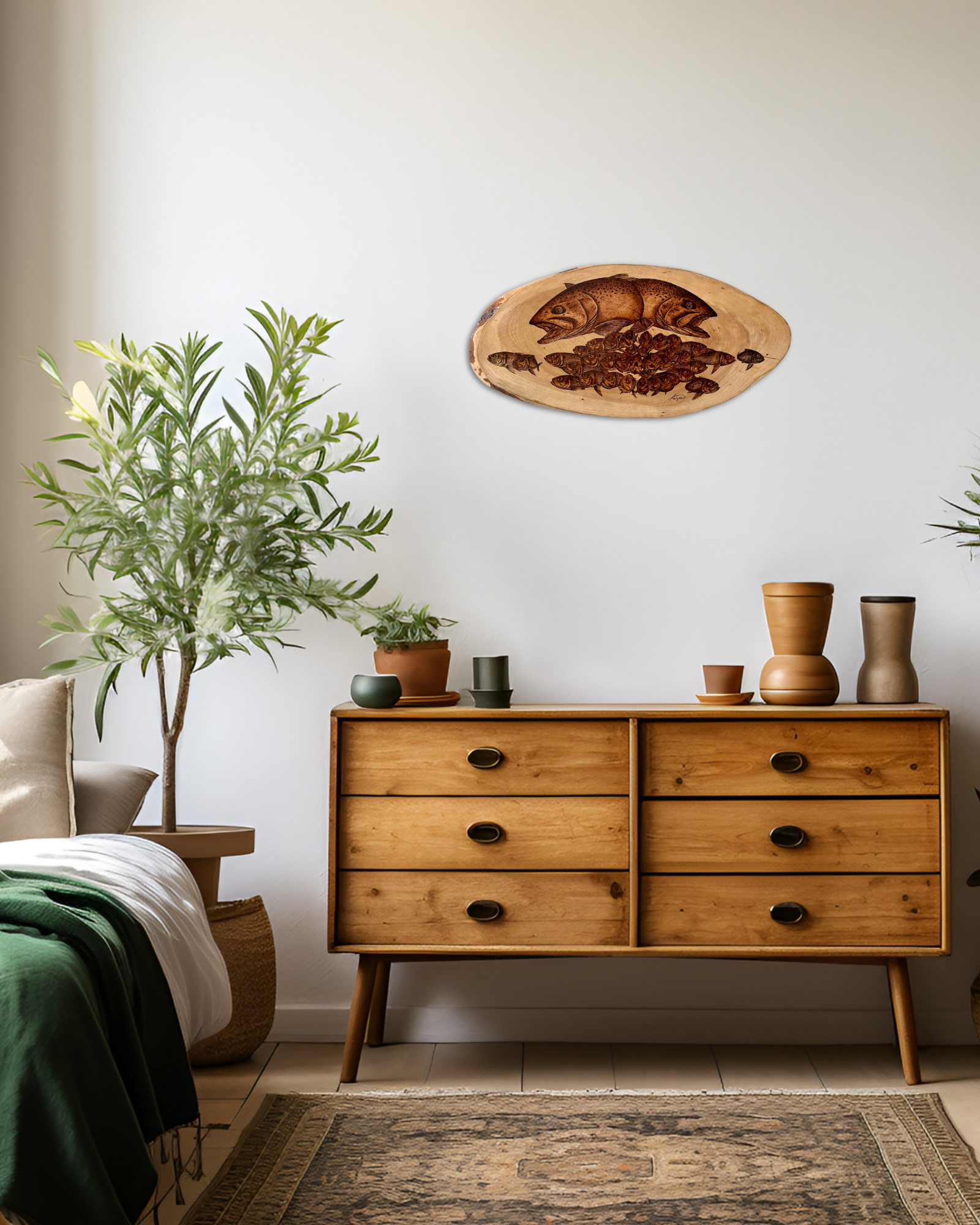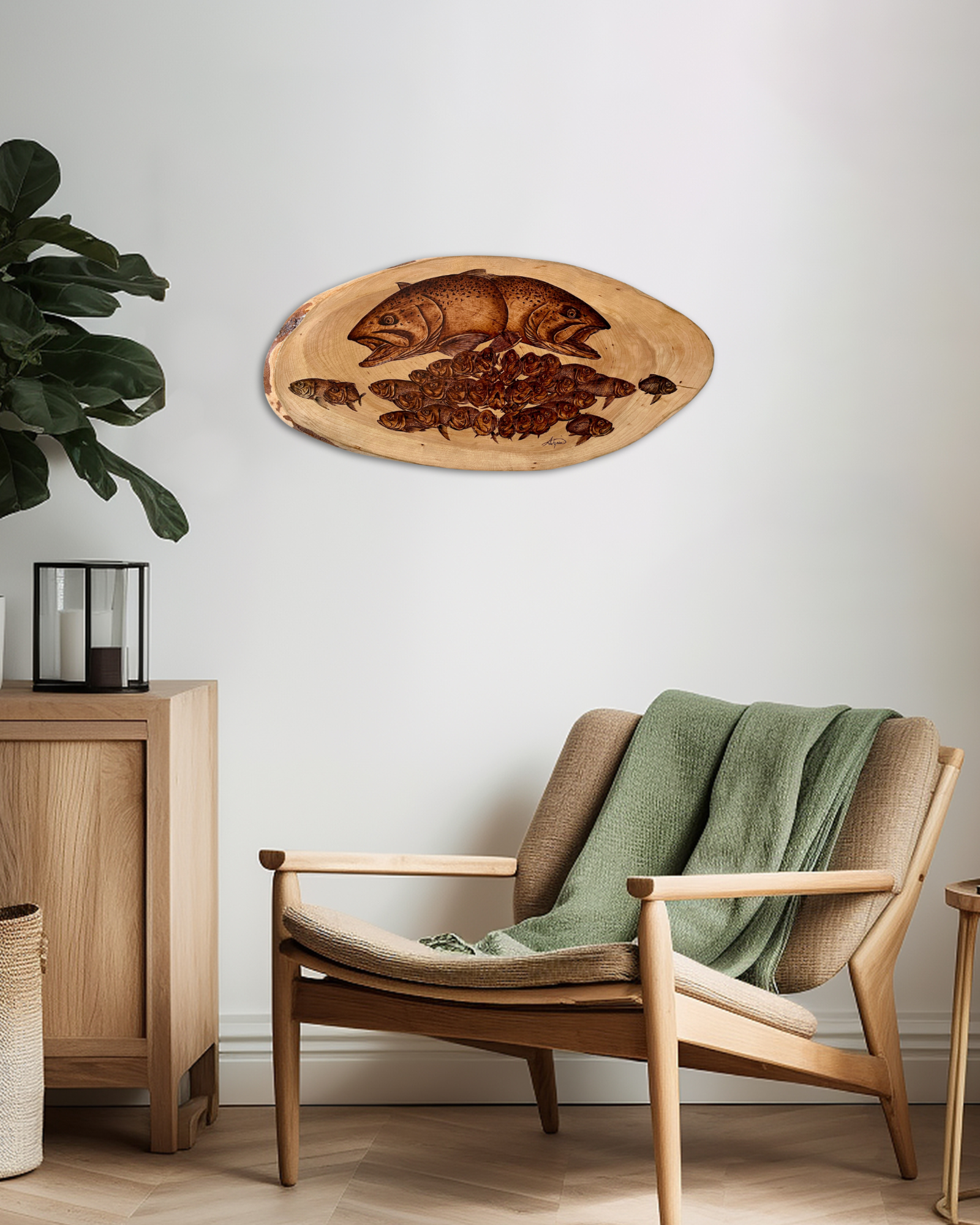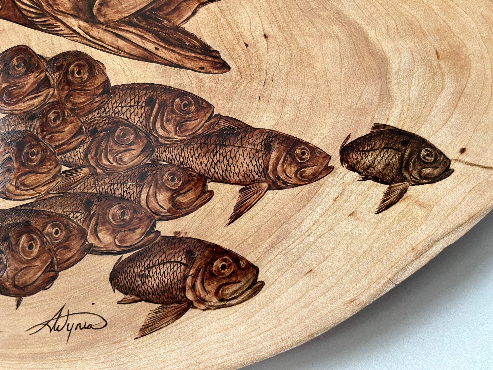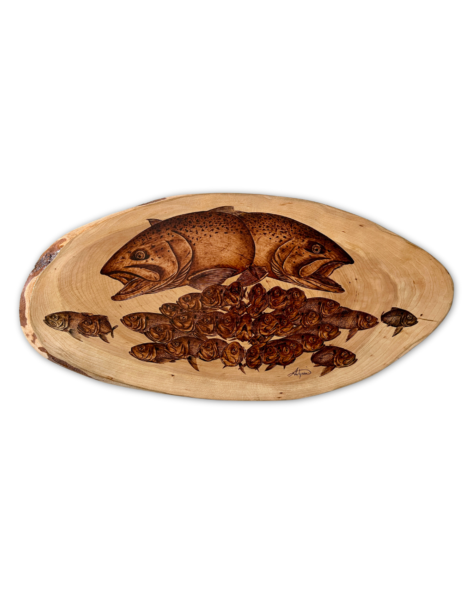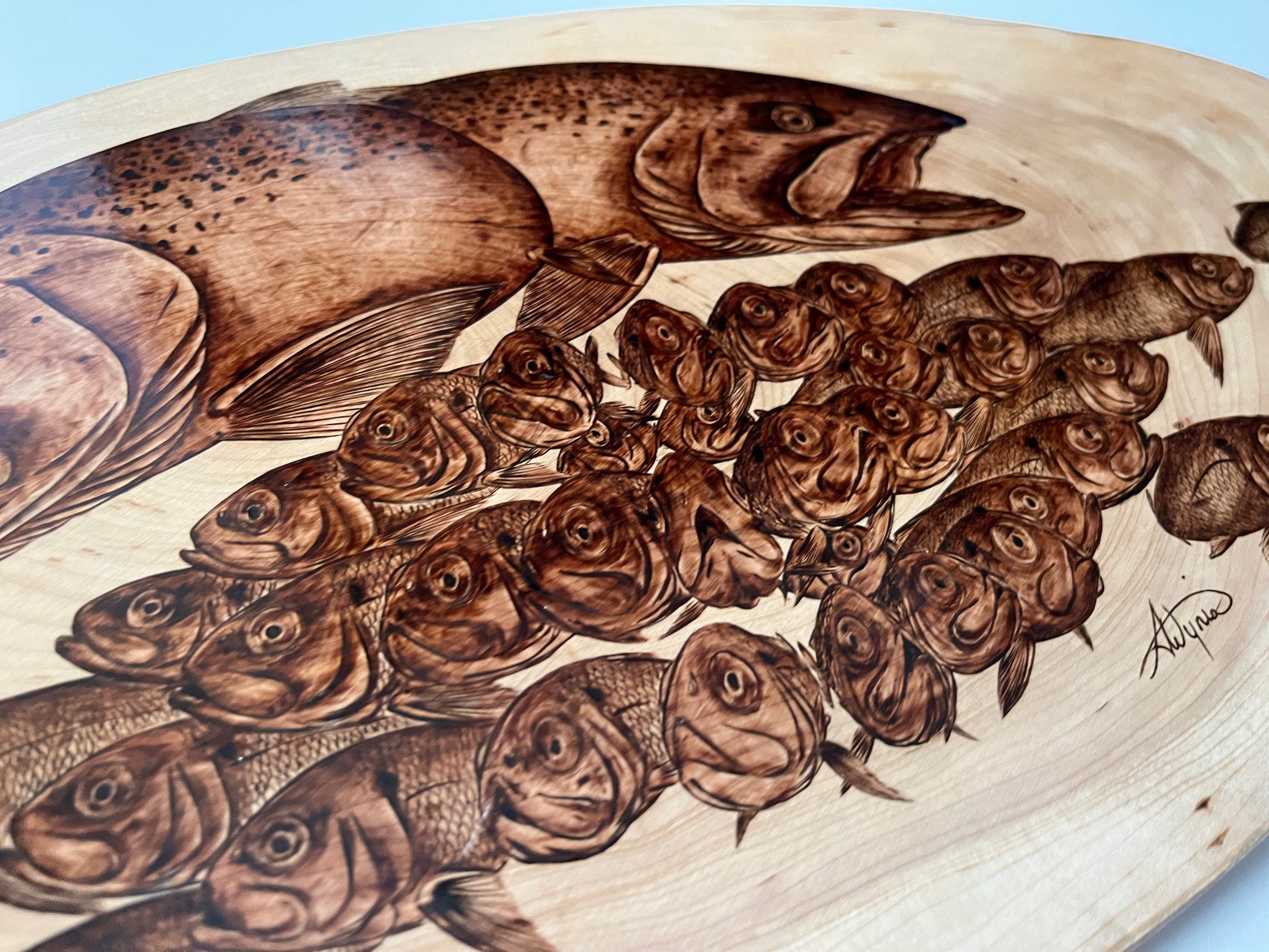 Original, one-of-one, hand-burned pyrography by Abby Wynia completed fall 2023, A ‘Wives Tail features two chinook (king) salmon (Oncorhynchus tshawytscha) pursuing a cloud of alewife (Alosa pseudoharengus) on bias-cut cherry.