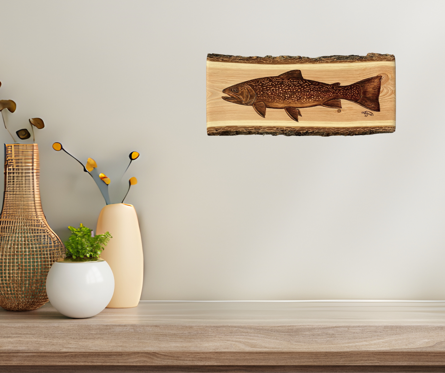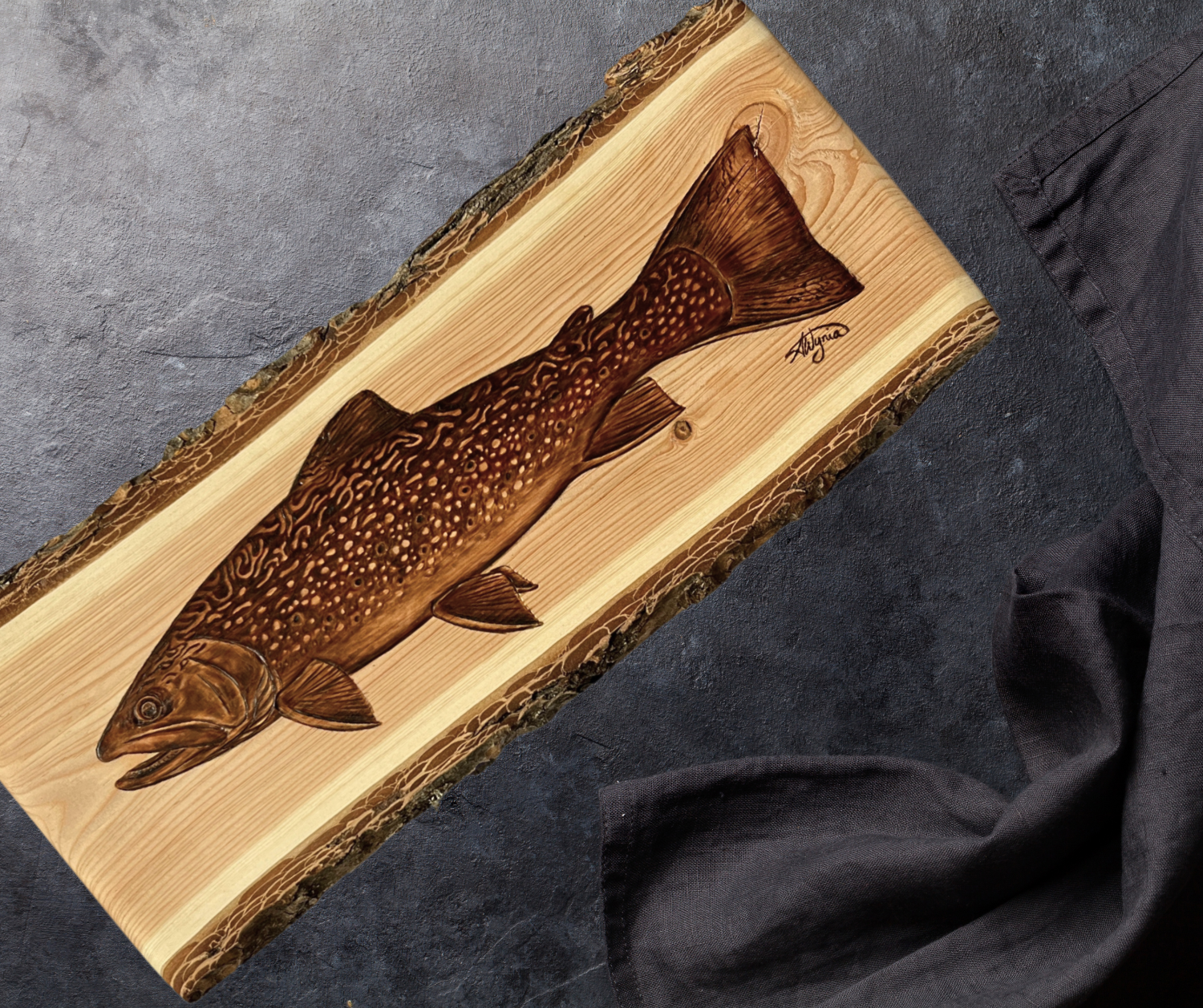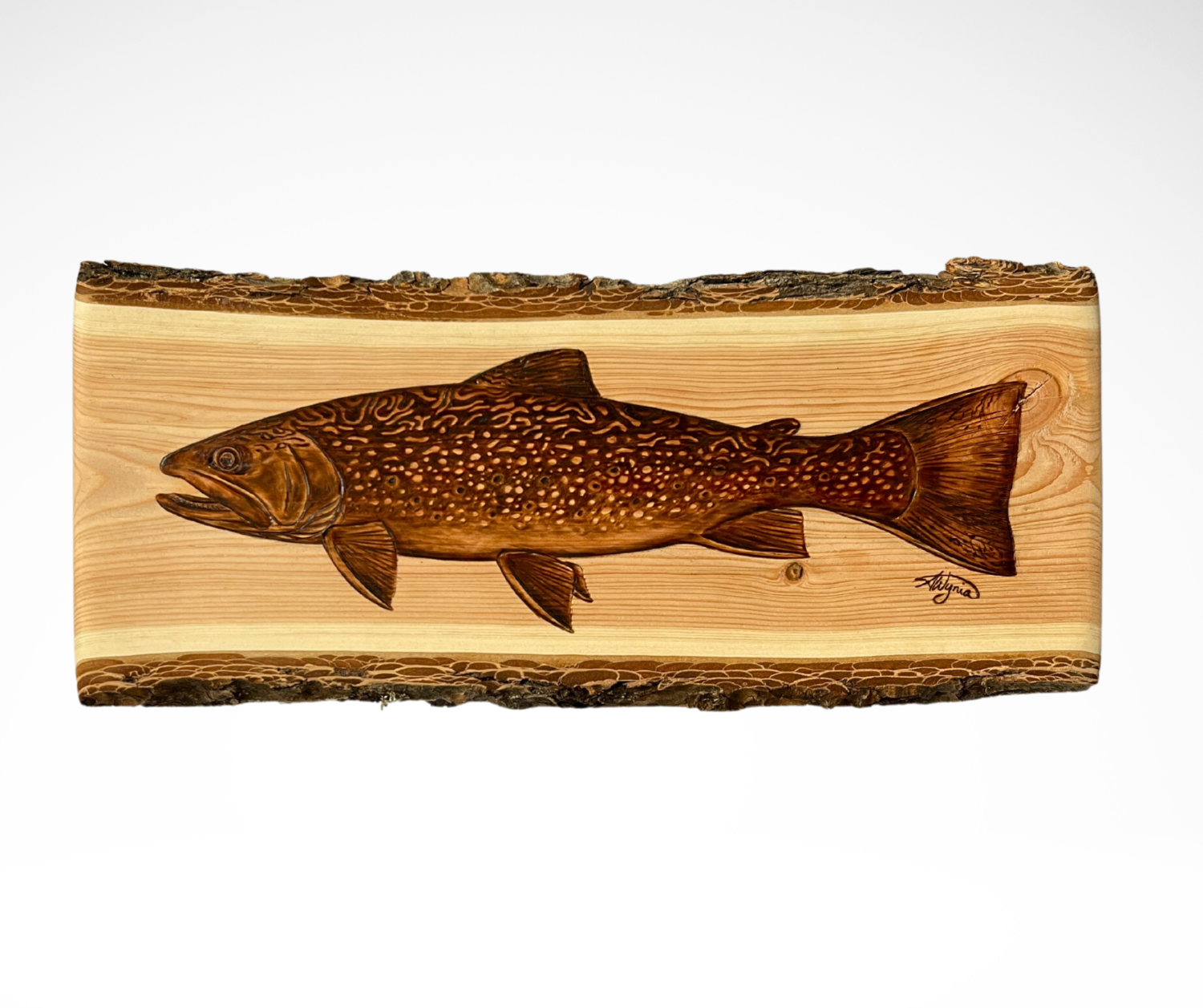 This is an original, one-of-one, hand burned piece by Abby Wynia, featuring a side profile portrait of a brook trout. This is one of three pieces completed on a matching set of douglas fir planks.