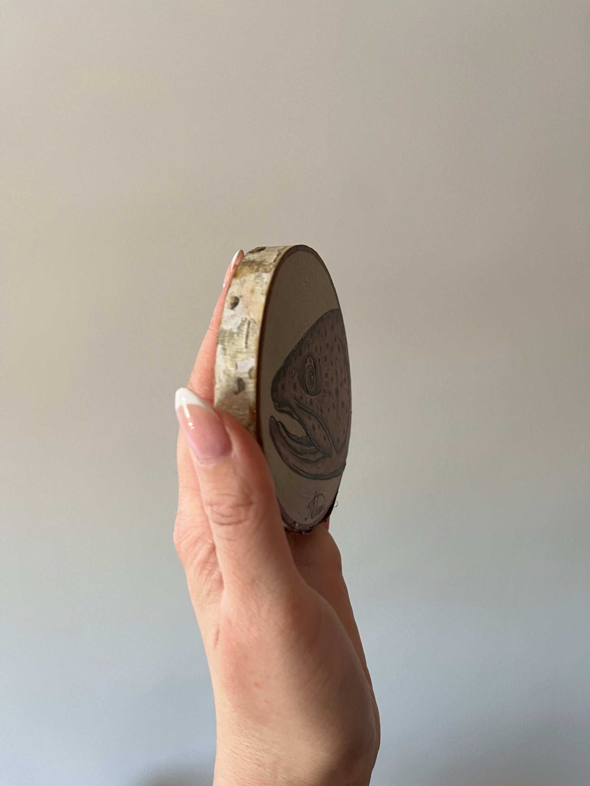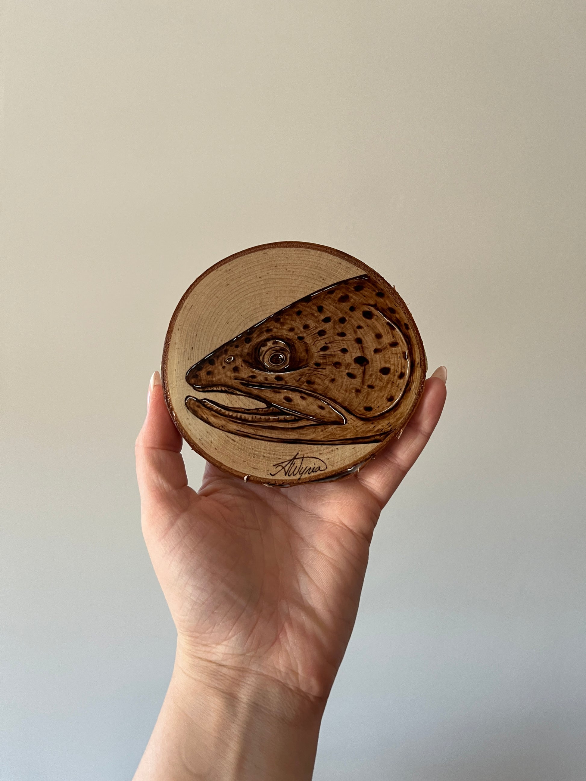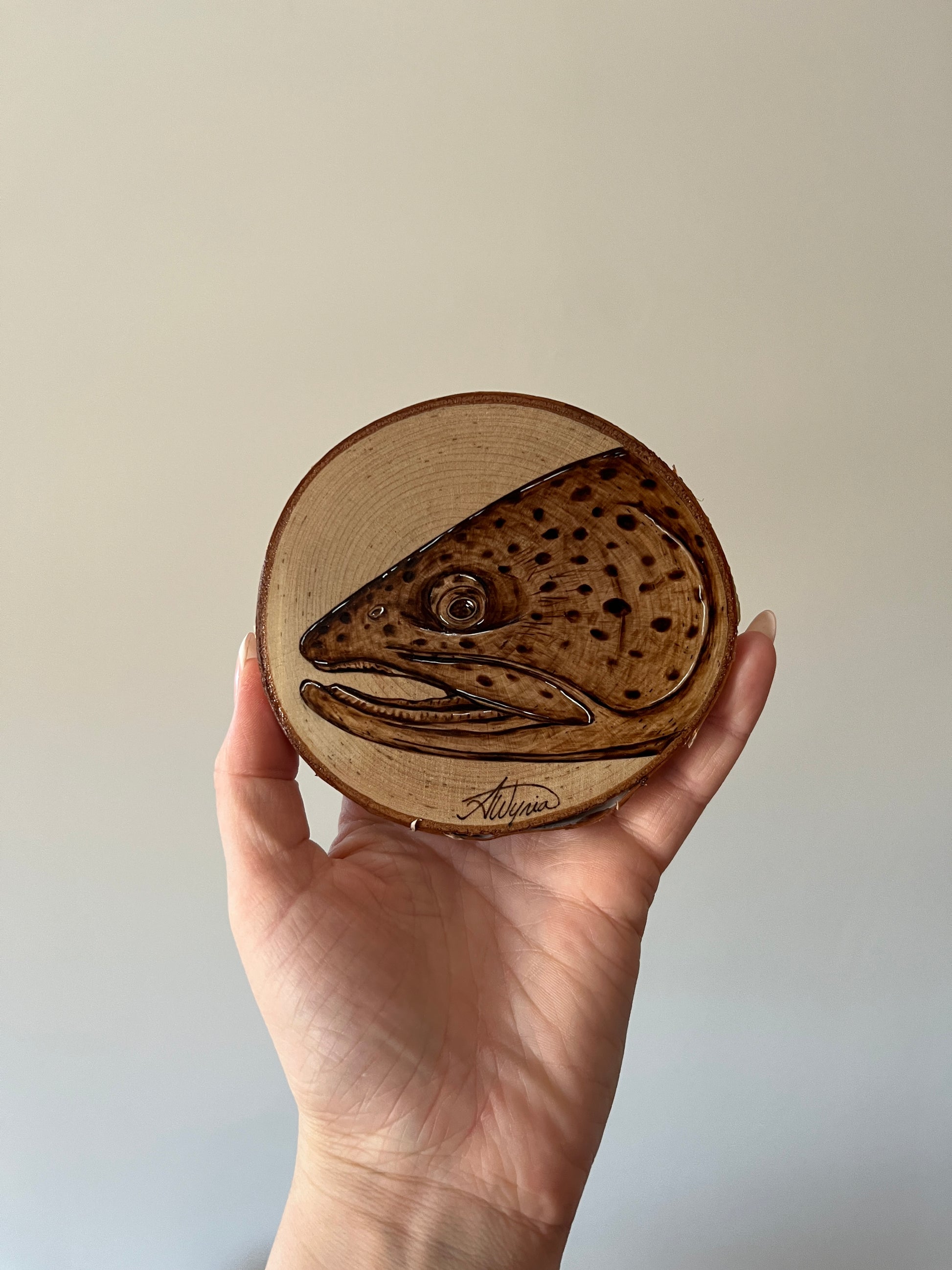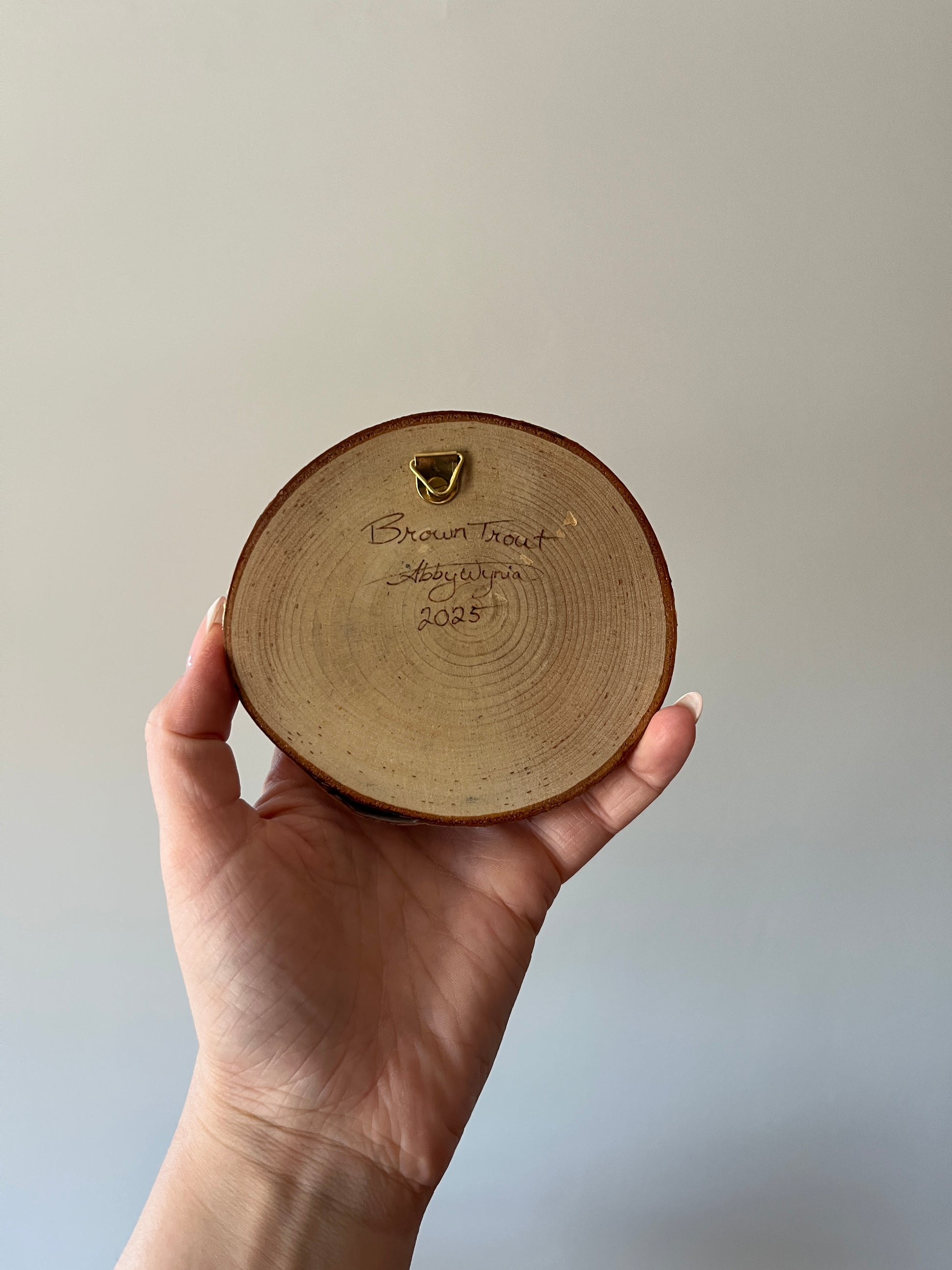 Hand burnt on birch, this 4” piece comes with a varathane finish and a small D-ring hanger installed on the back.