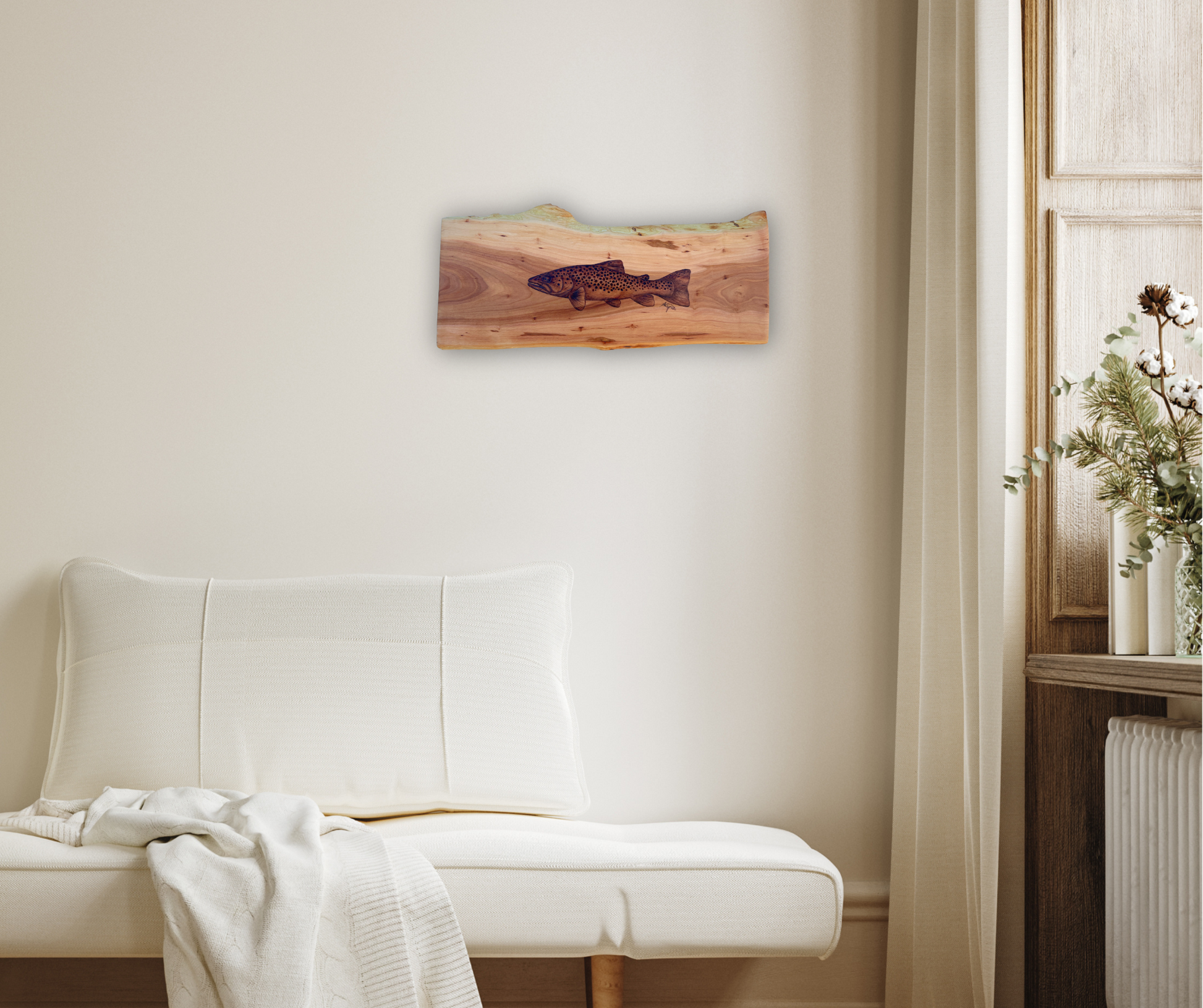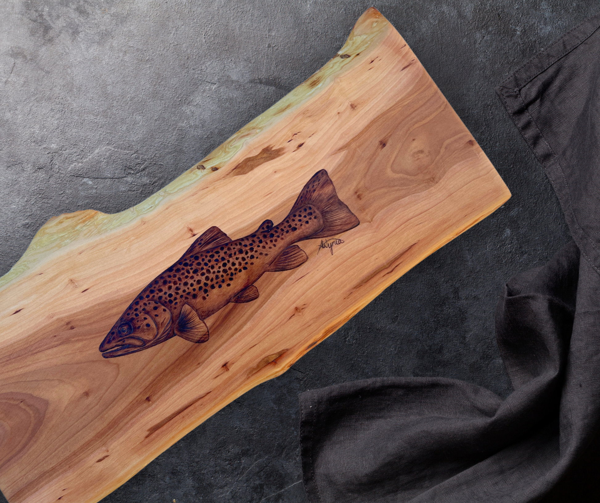 This hand burned piece features a brown trout portrait on live edge applewood. The piece has been treated with a food safe mineral oil and beeswax mixture for use as a serving board, or perhaps the addition of hanging hardware to the back of the board would suit your needs for some fish-themed artwork in your kitchen, office, livingroom, etc.