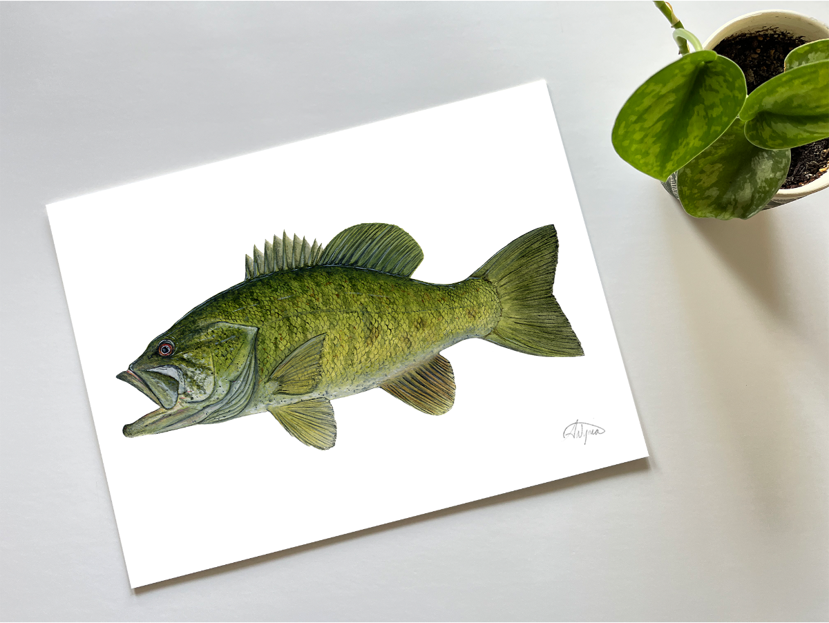 This is a giclee print of an original smallmouth bass watercolour painting by Abby Wynia. It was painted with Silver brushes and Sennelier watercolours on Arches cold-pressed cotton paper. The piece, titled "Casting Call" is as vibrant and detailed as the fish itself.