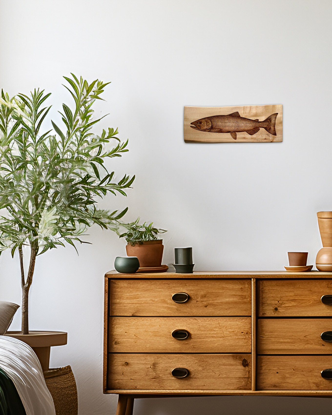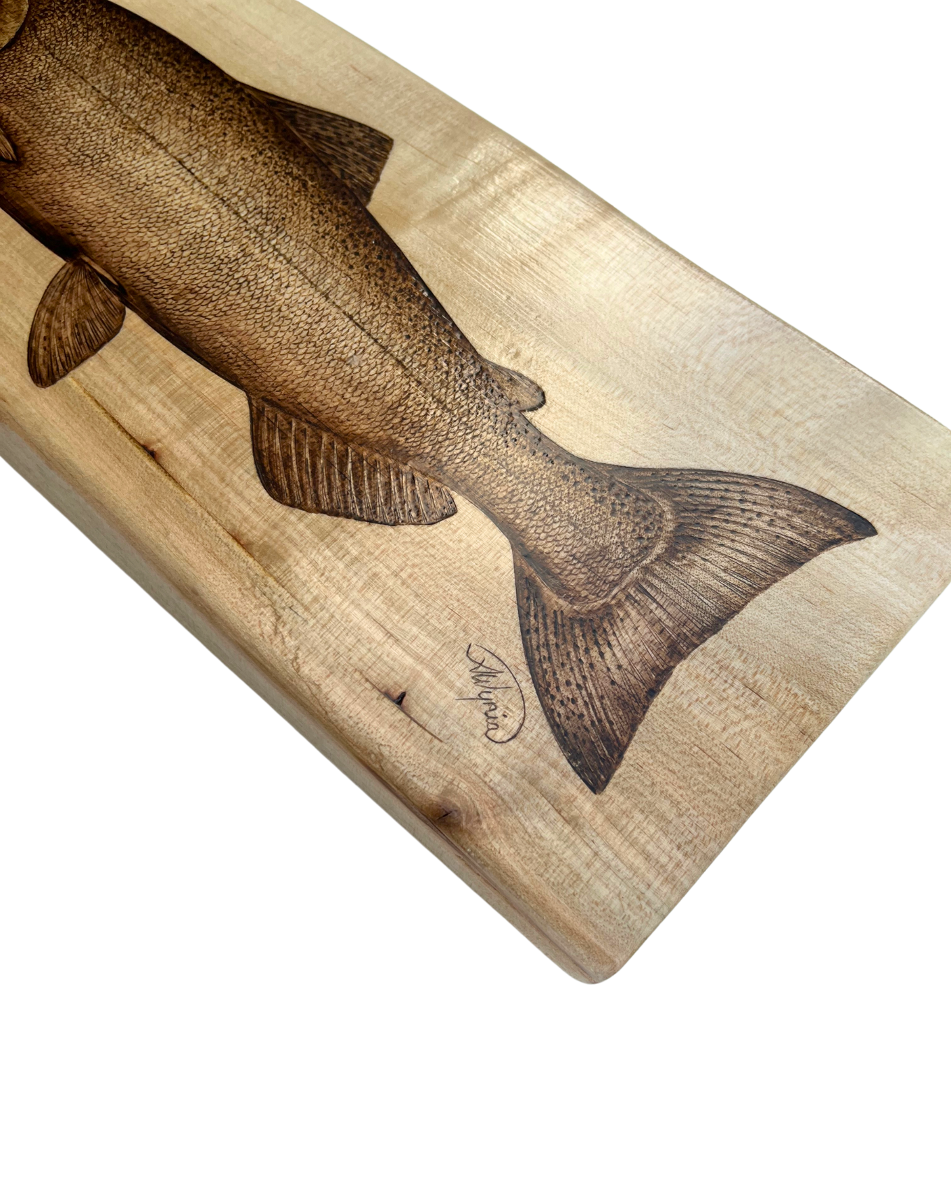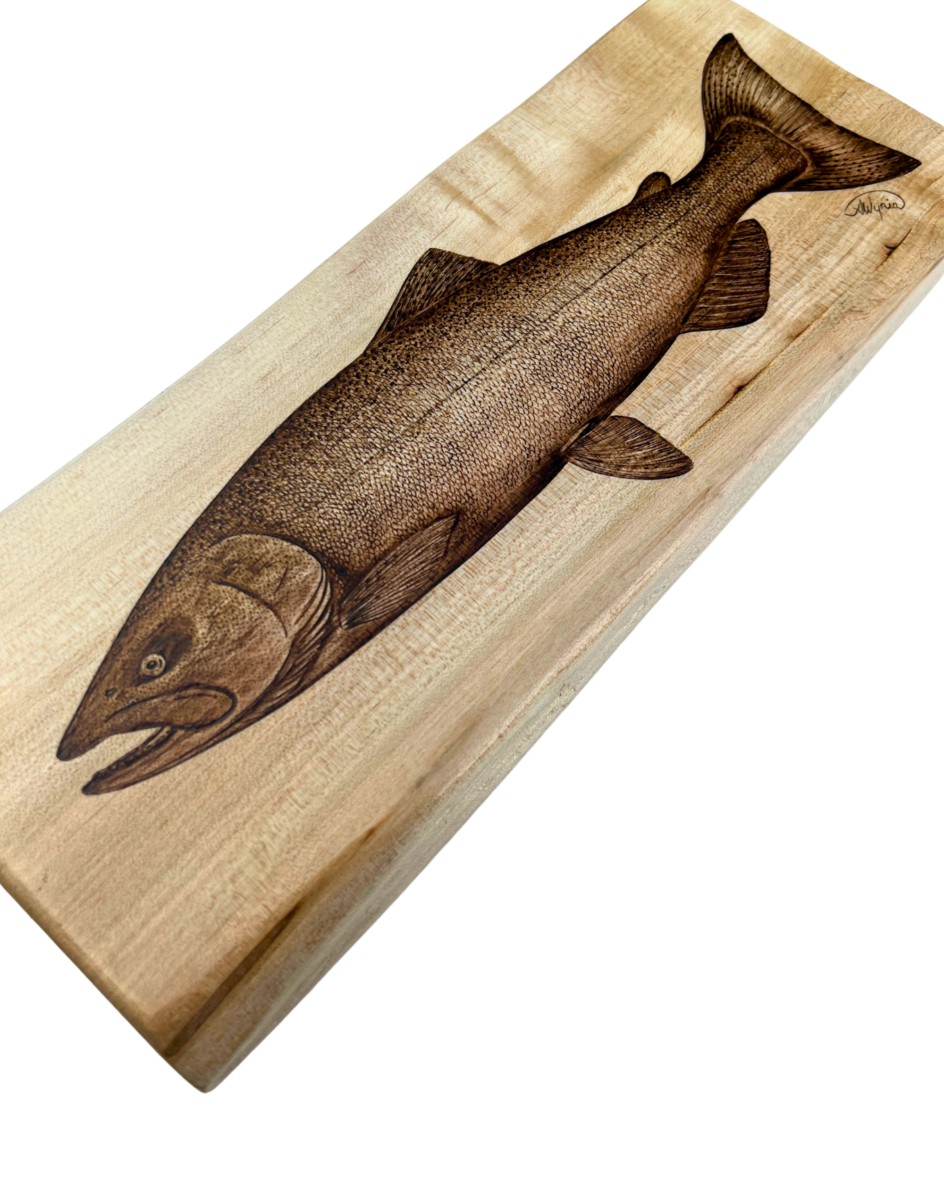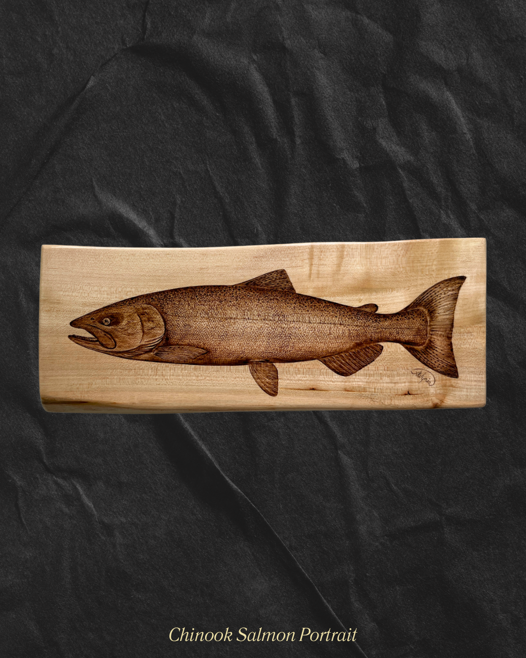 This piece features a portrait of a chinook (king) salmon, burned on live edge maple that has been hand selected from a local wood shop.