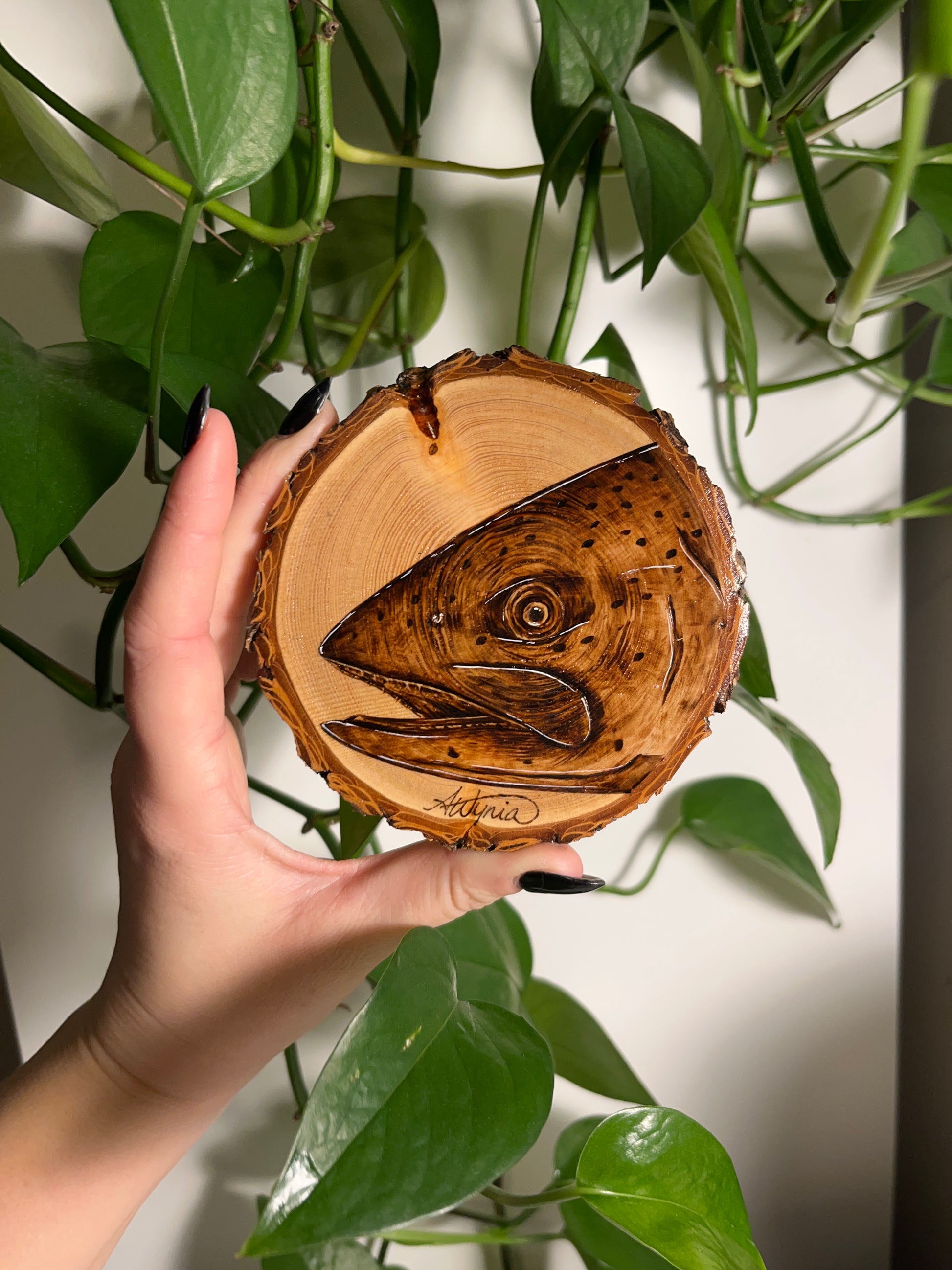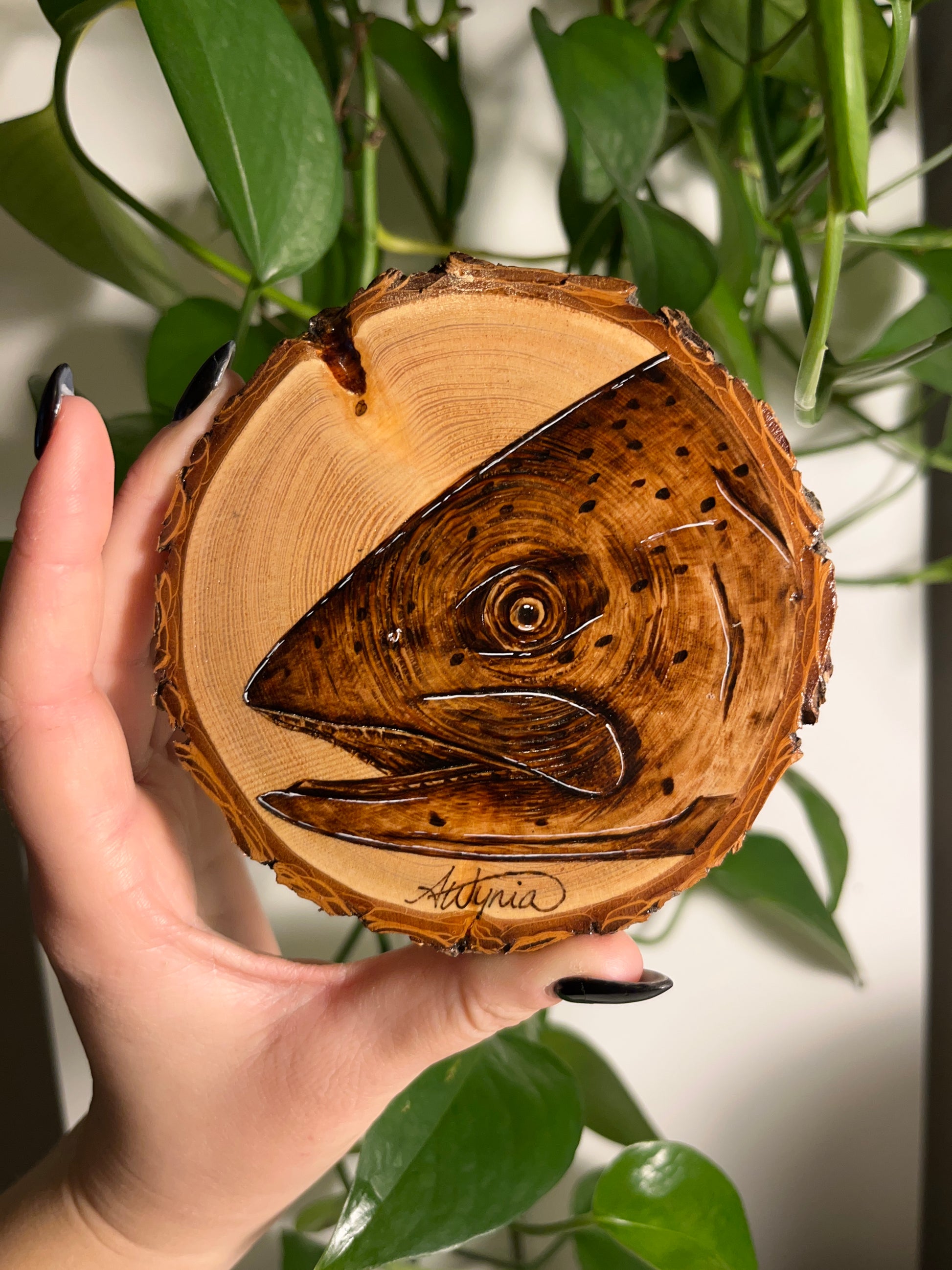 This little piece of original artwork measures 4.5” in diameter and features a chinook/king salmon burned on an Alberta douglas fir round.