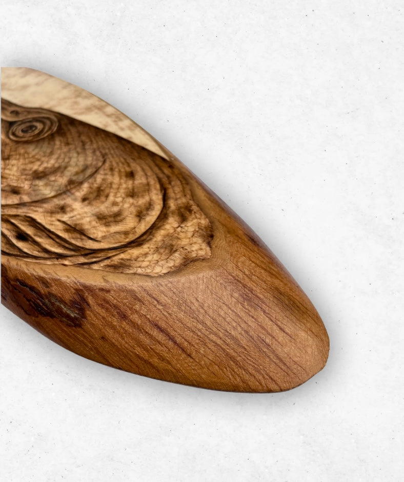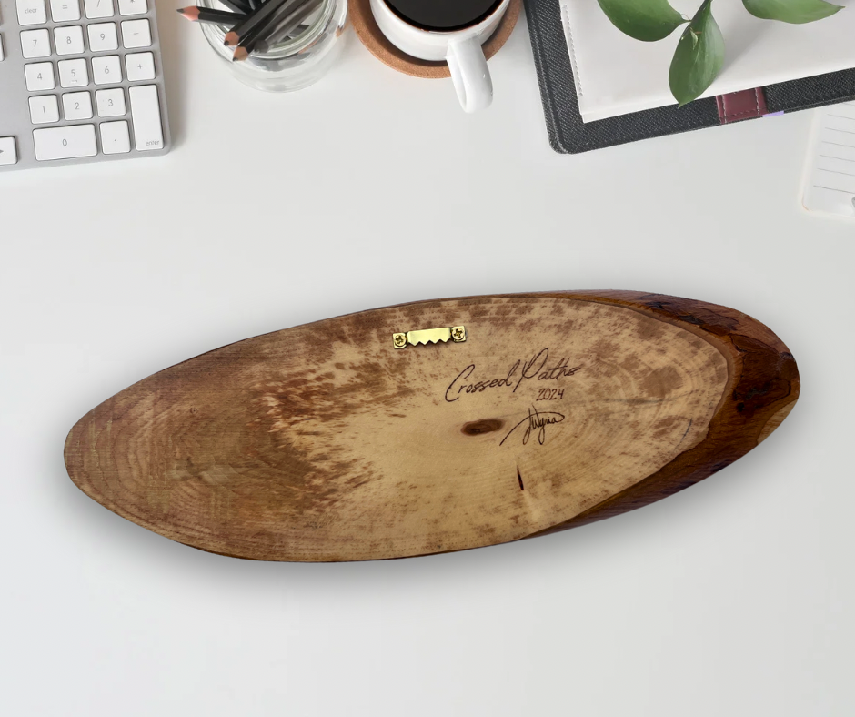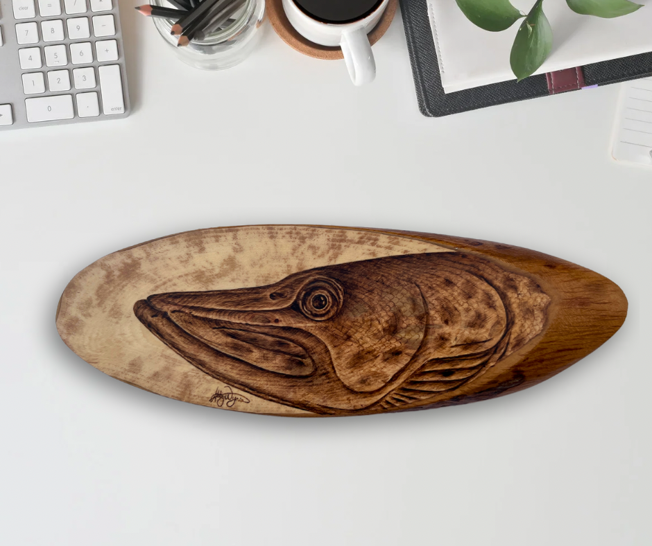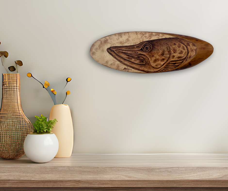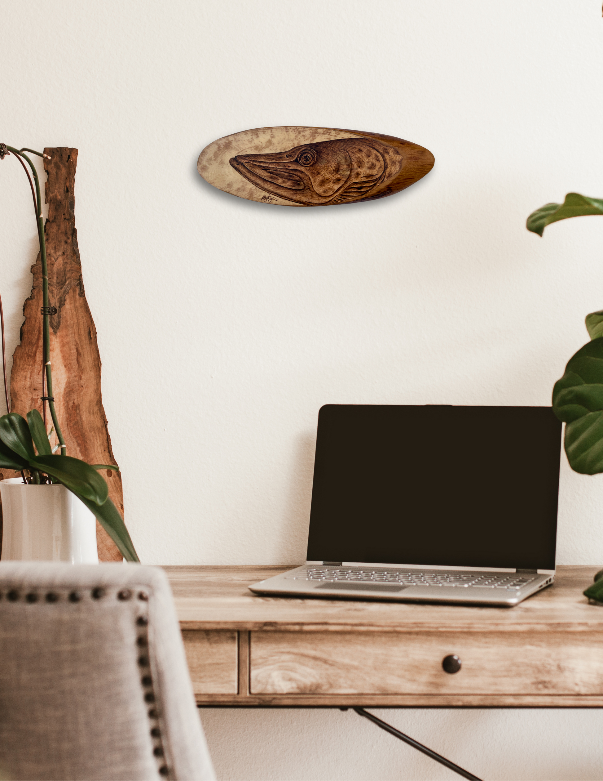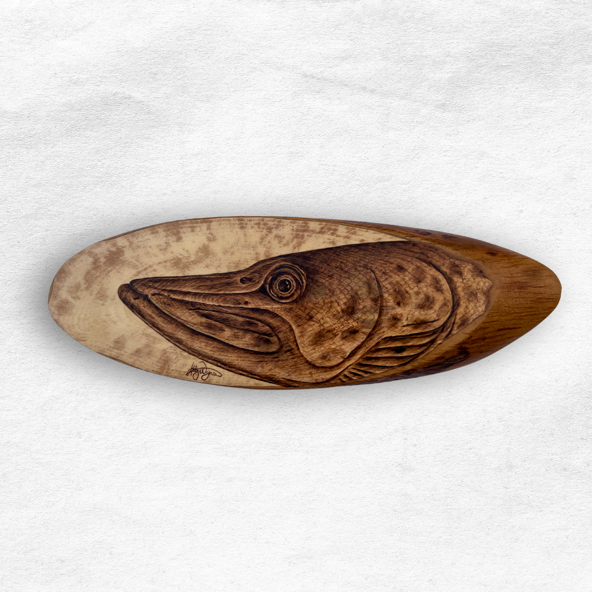 This original, one-of-one piece by Abby Wynia, Crossed Paths was wood burned by hand (pyrography), and features the close up portrait of a muskie on a live edge bias-cut wood.
