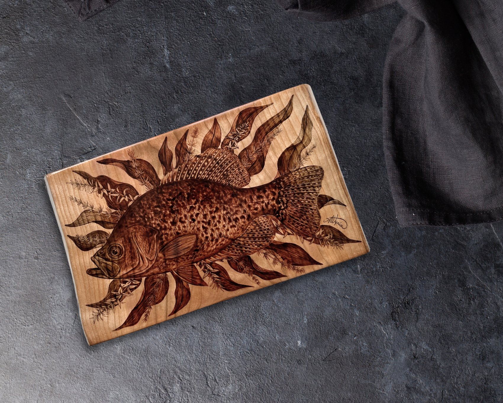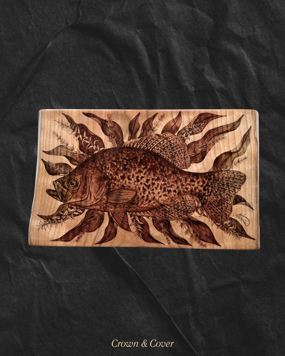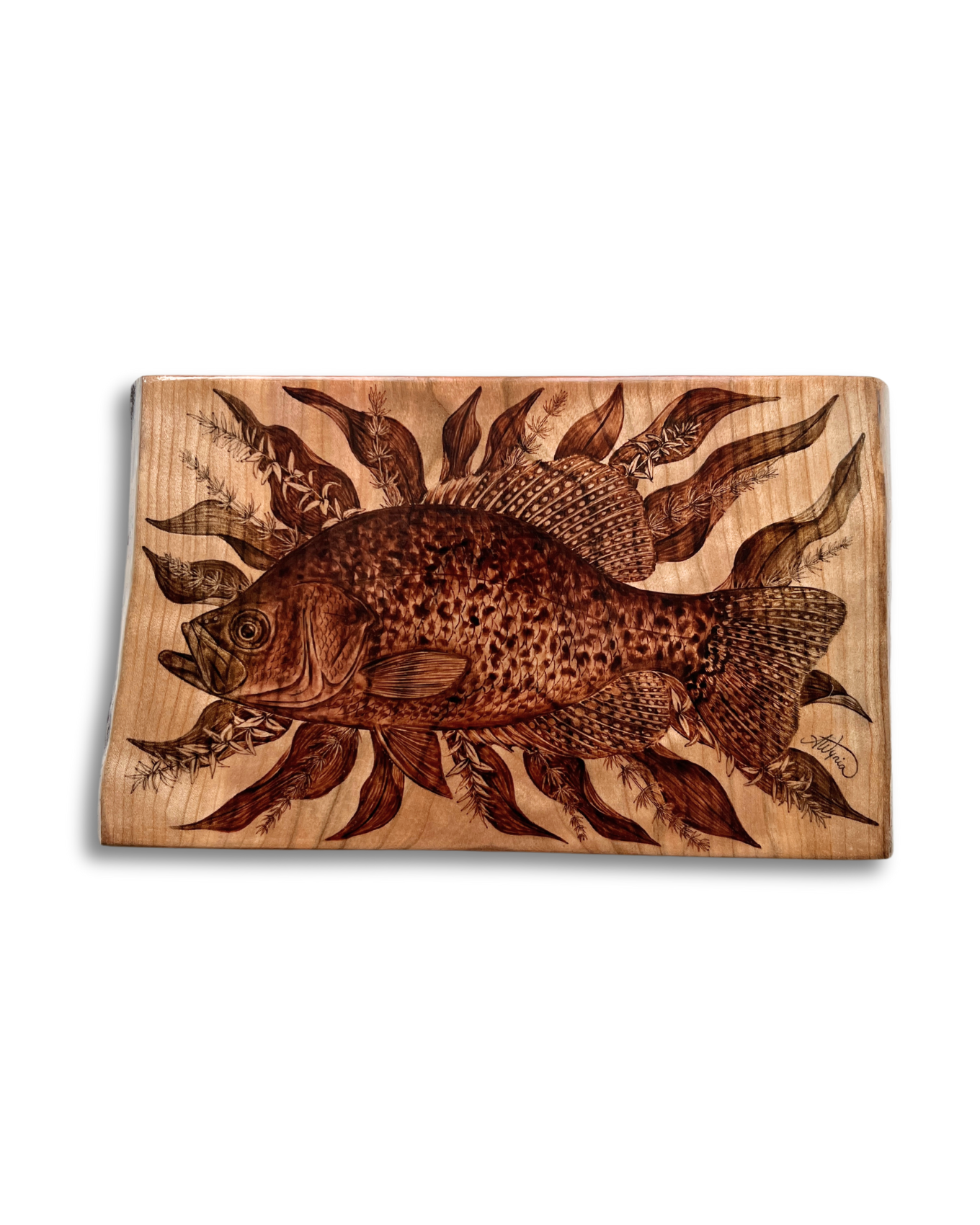 This piece features a portrait of a black crappie framed by the leaves of Richardson's pondweed (Potamogeton richardsonii), muskgrass (Chara sp.) and Canada waterweed (Elodea canadensis). The work is burned on live edge cherry that has been hand selected from a local wood shop. The piece originally started as a simple "fish on wood" concept that I'm quite familiar with, but quickly morphed into something more elaborate.