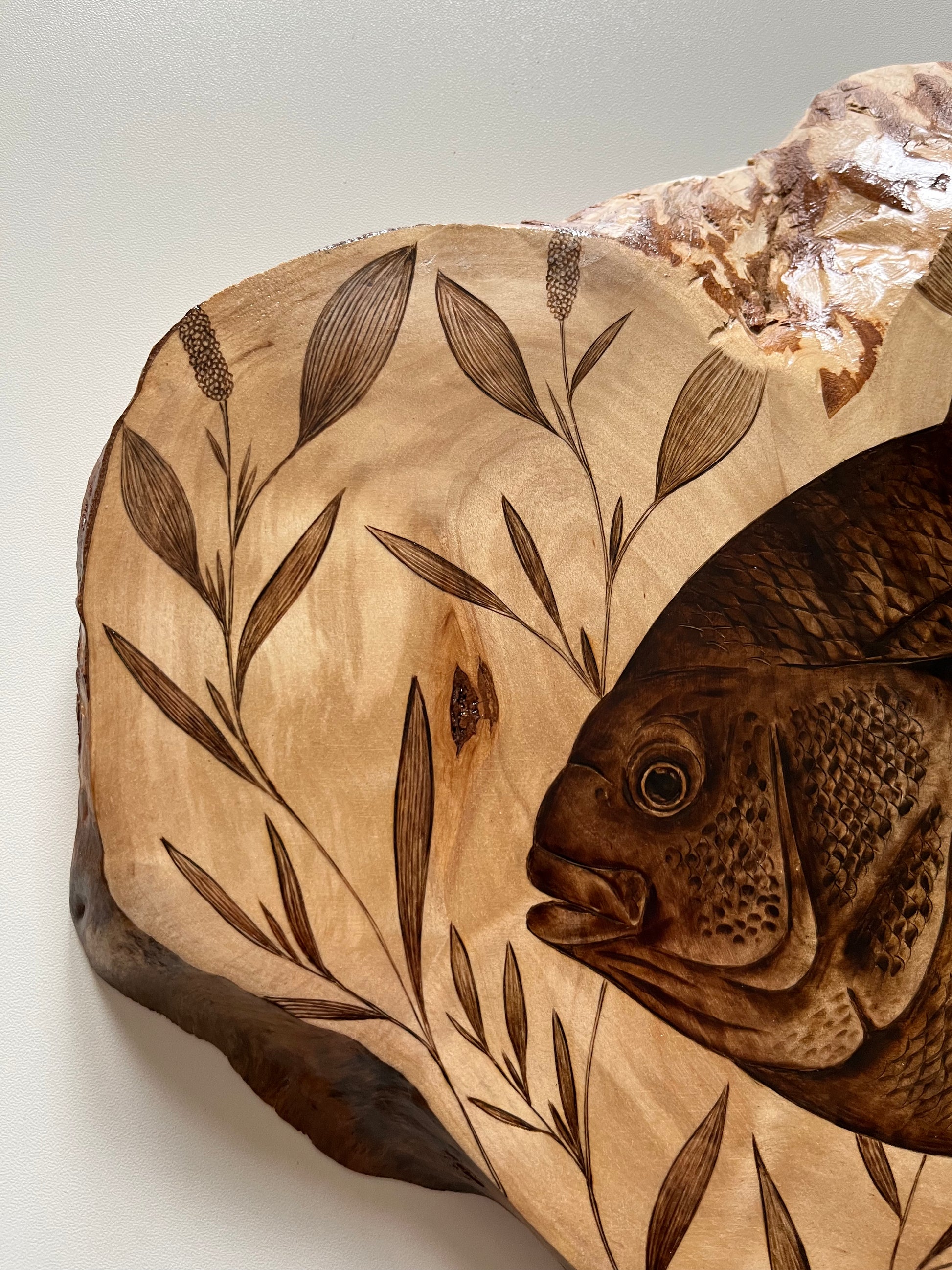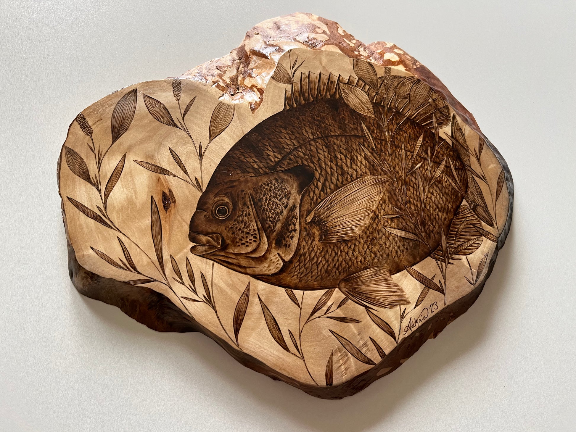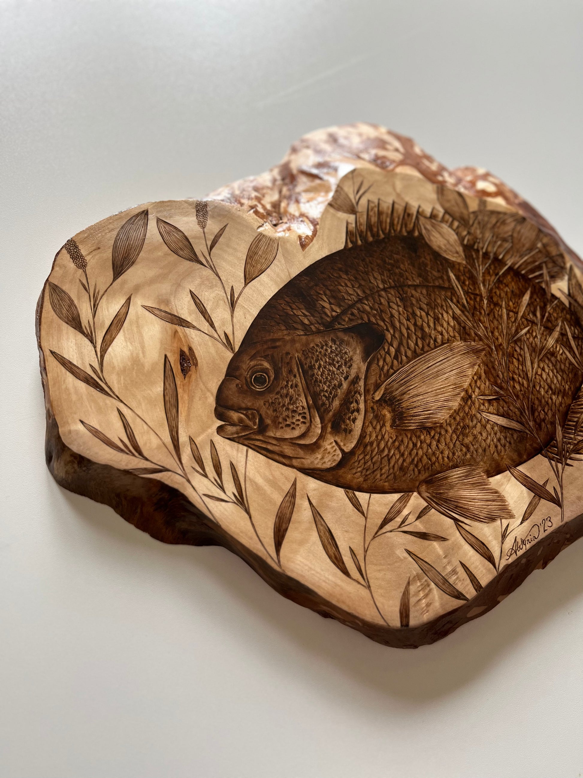 Original, one-of-one, hand-burned pyrography by Abby Wynia completed May 2023, Growth features a large bluegill (Lepomis macrochirus) swimming through a sea of variable-leaf pondweed (Potamogeton gramineus).