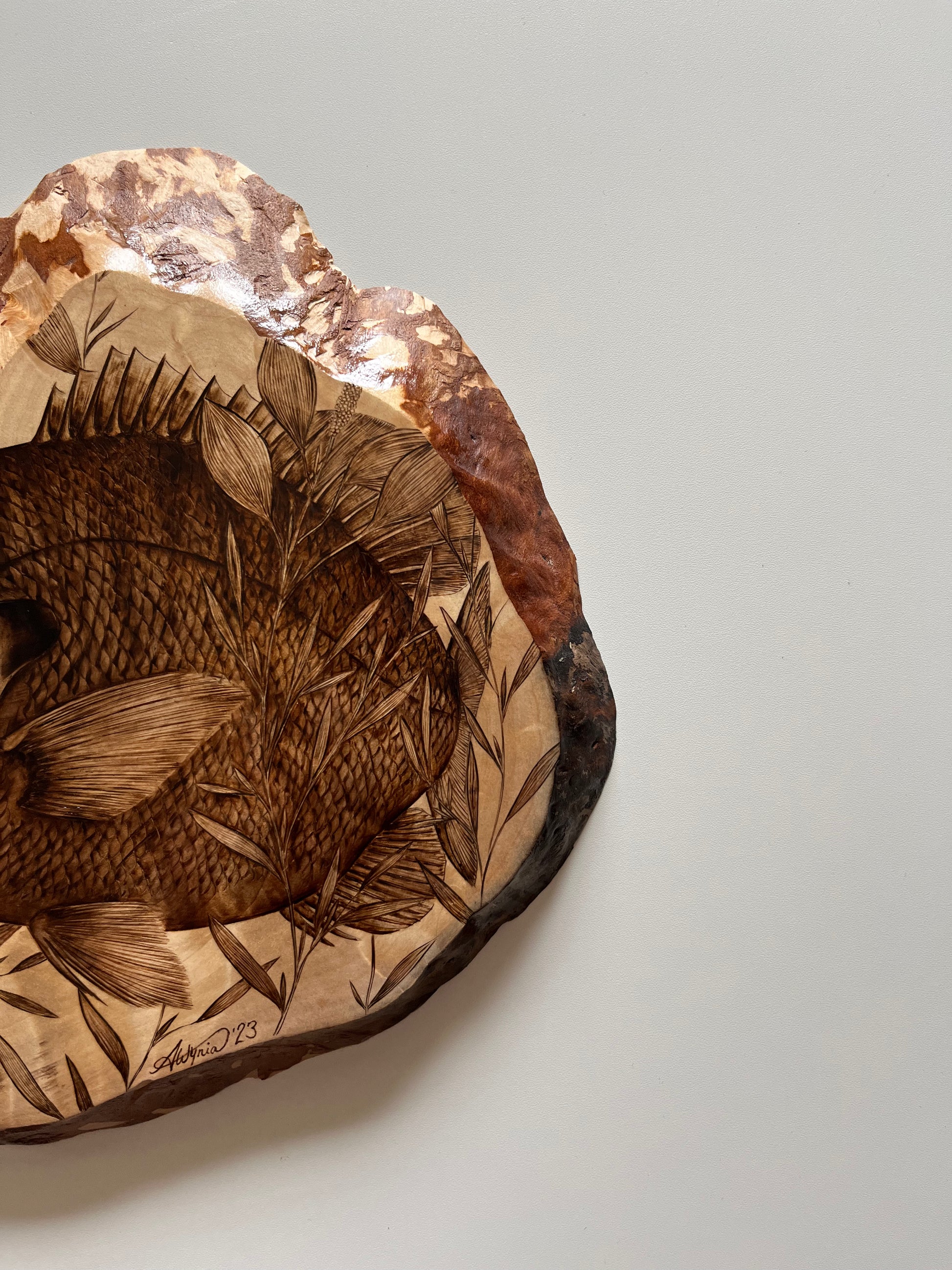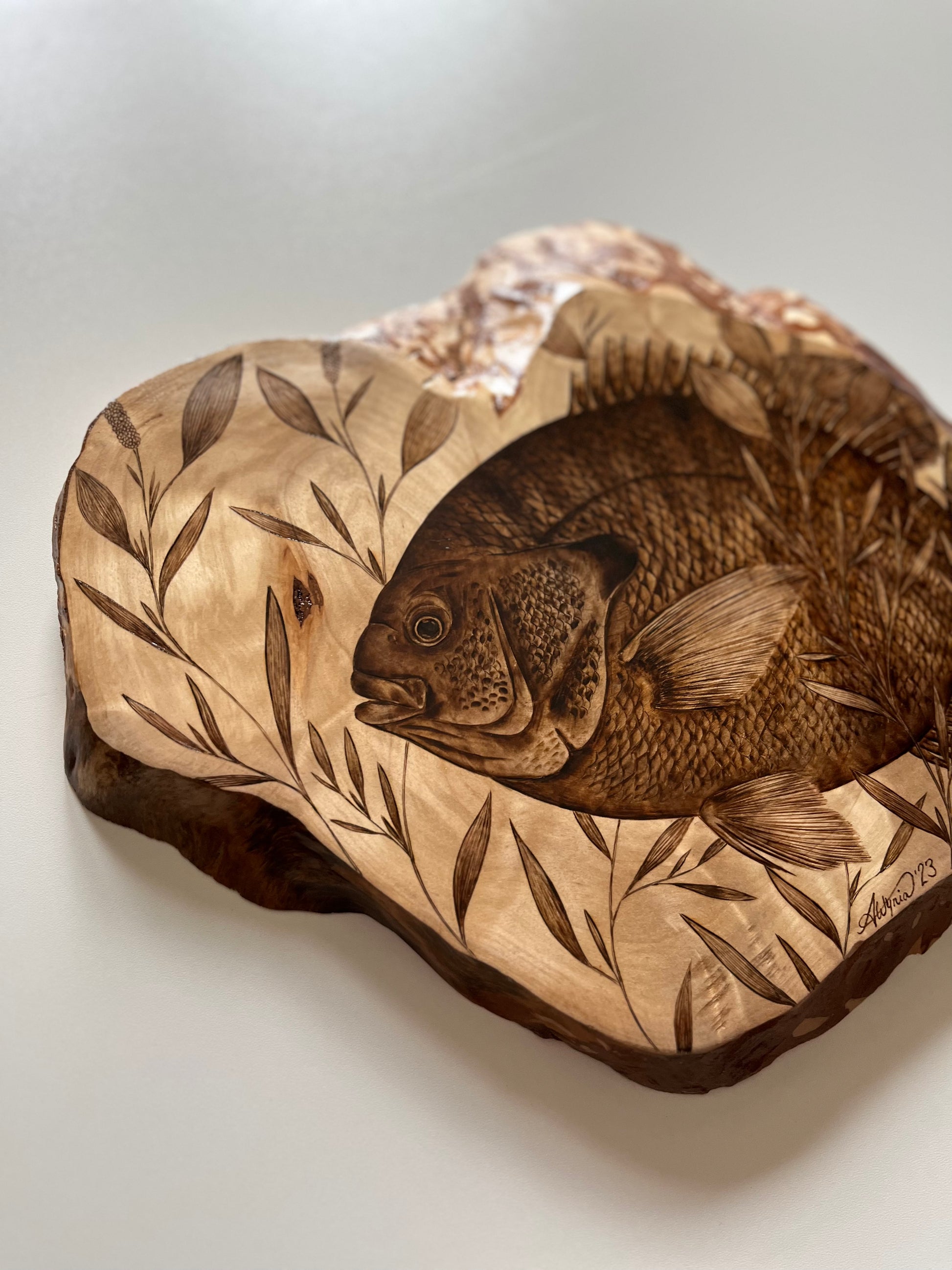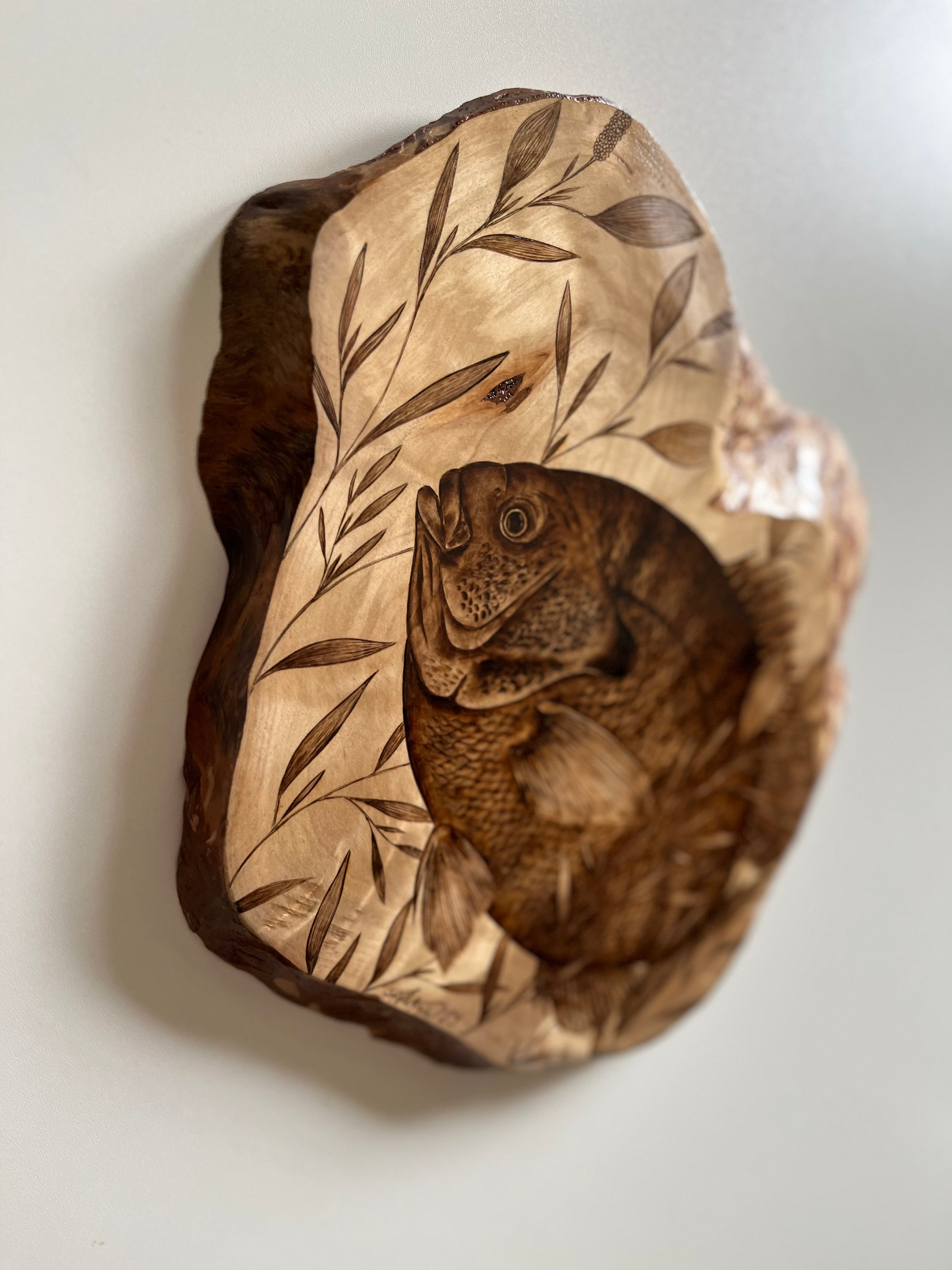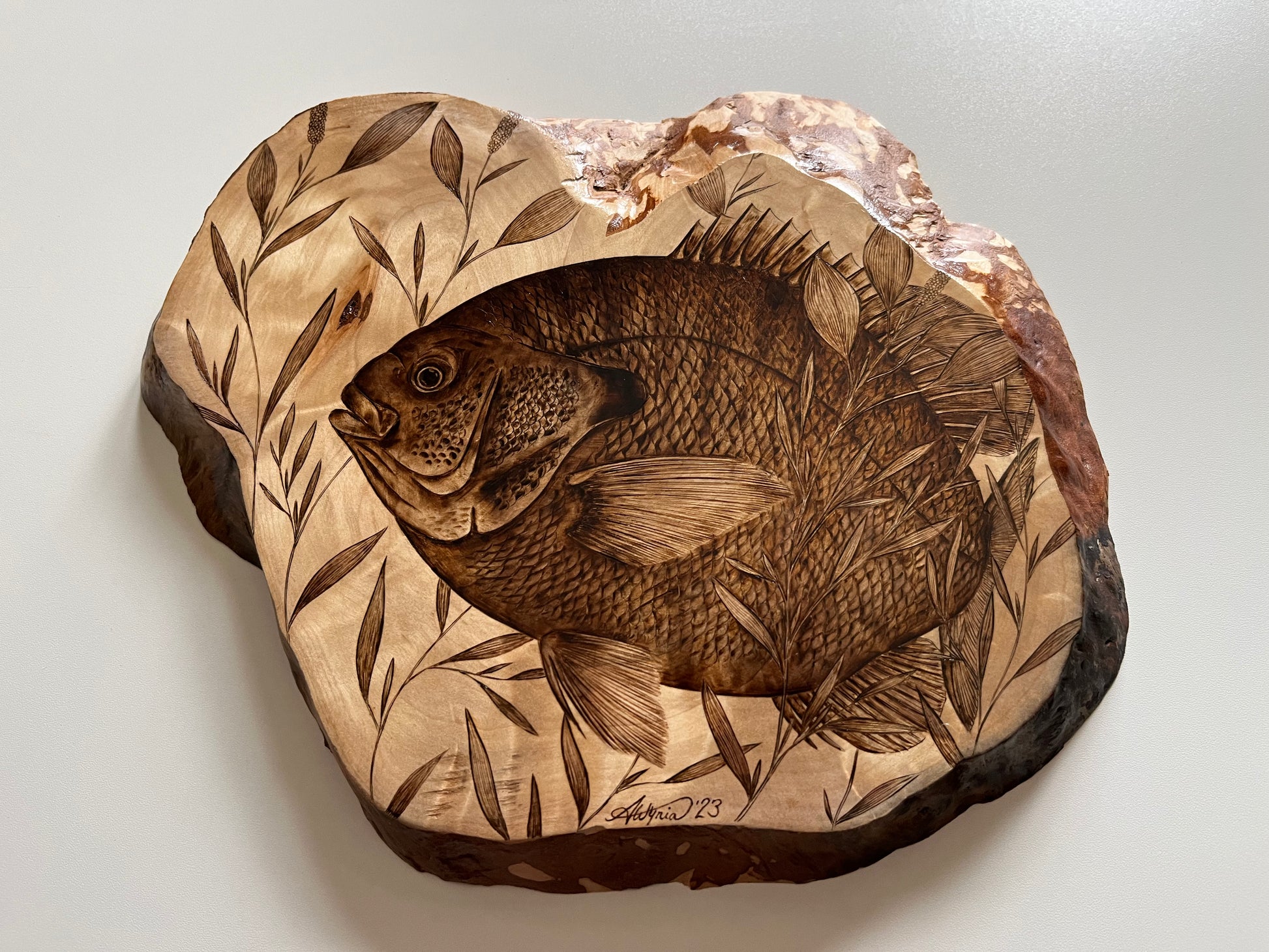 Original, one-of-one, hand-burned pyrography by Abby Wynia completed May 2023, Growth features a large bluegill (Lepomis macrochirus) swimming through a sea of variable-leaf pondweed (Potamogeton gramineus).