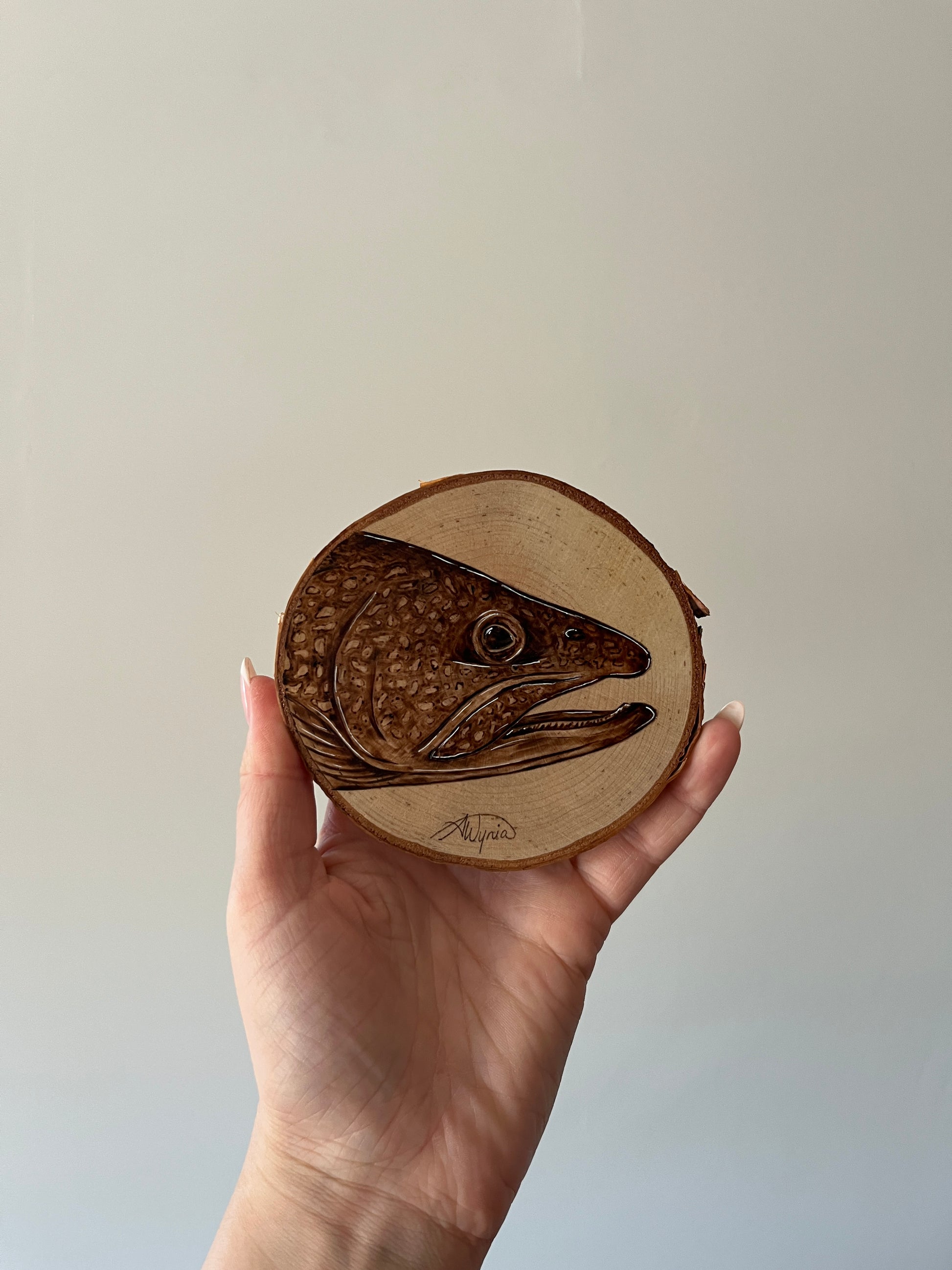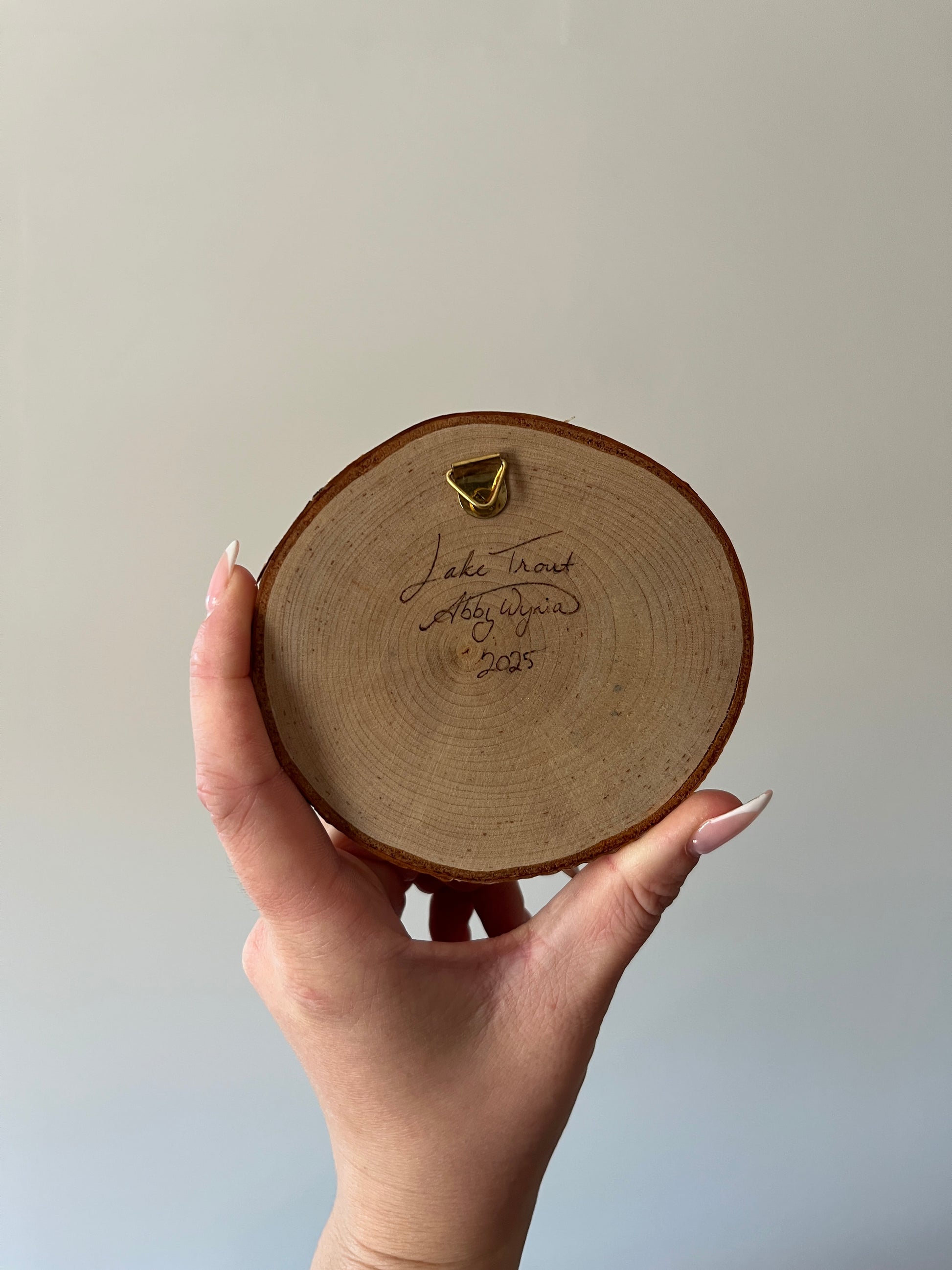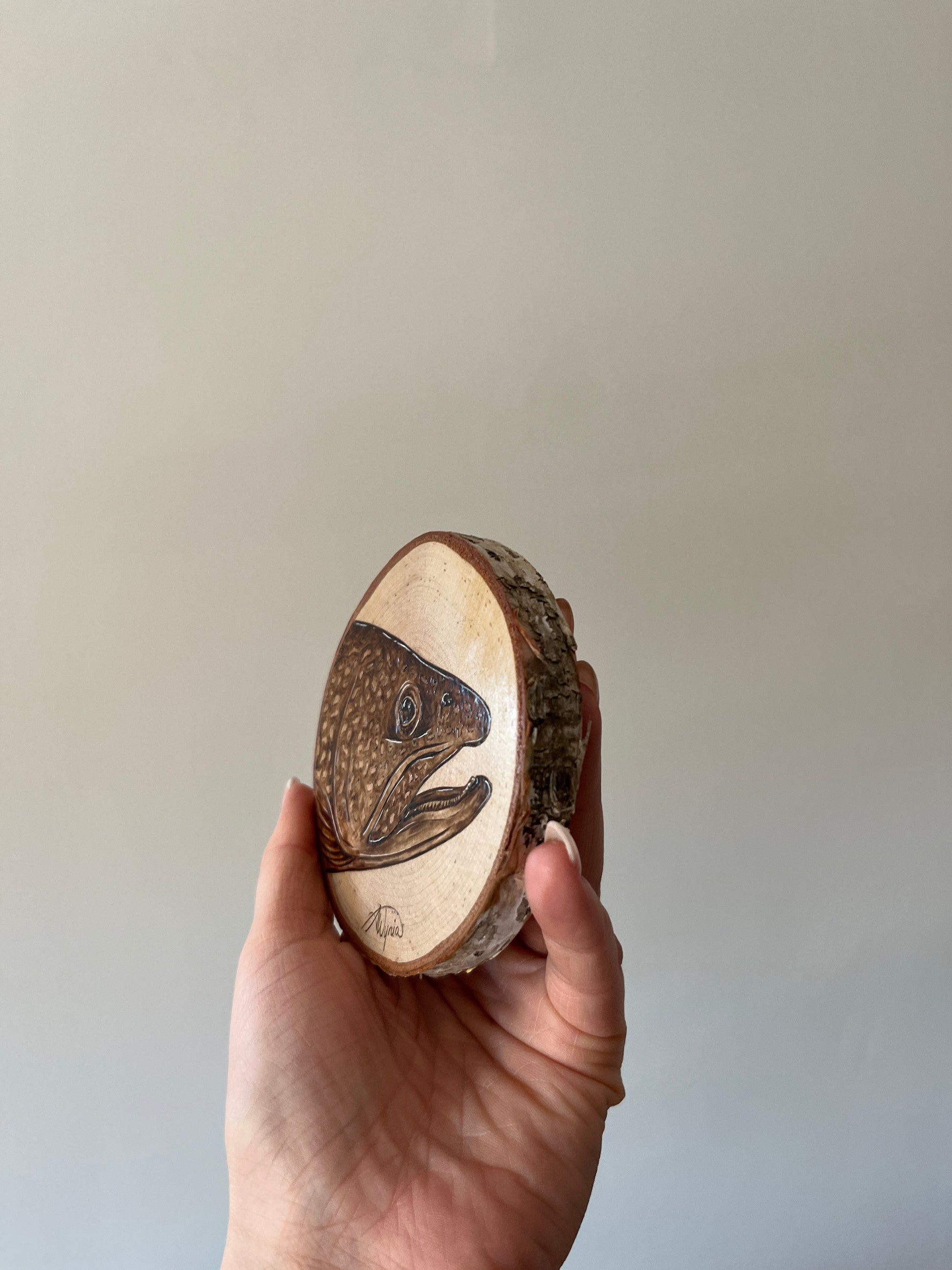 Hand burnt on birch, this 4” piece comes with a varathane finish and a small D-ring hanger installed on the back.
