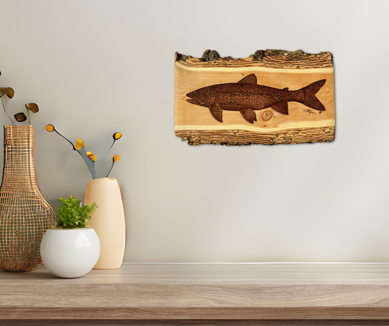 This is an original, one-of-one, hand burned piece by Abby Wynia, featuring a side profile portrait of a lake trout. This is one of three pieces completed on a matching set of douglas fir planks.