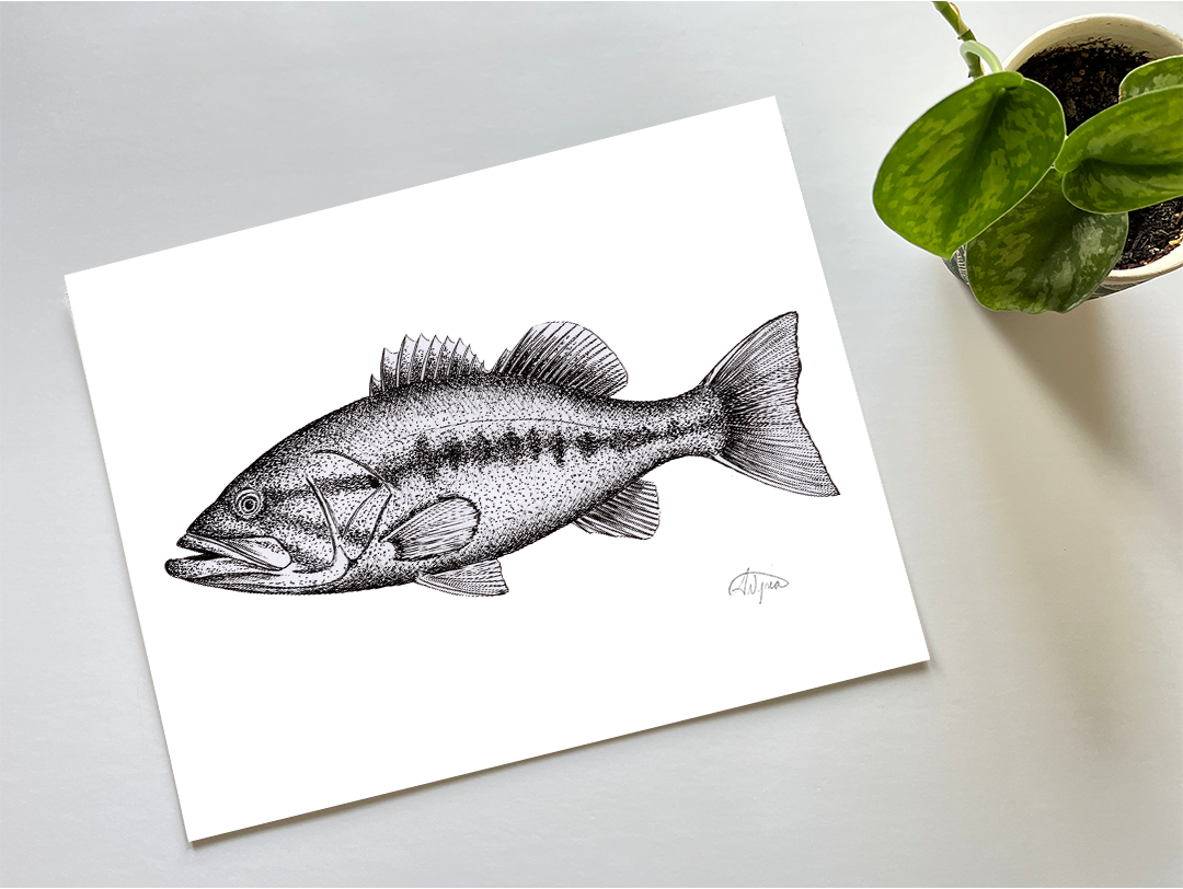 Techniques of cross-hatching, stippling, and fine linework were used to create this largemouth bass piece. The print is available in 5x7” and 8x10” sizes, packaged with a backing board in a cellophane sleeve.