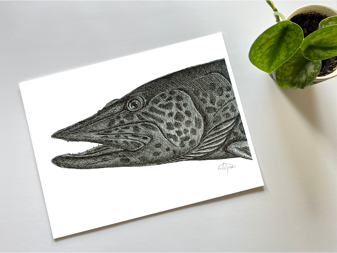 The print is of an original pen and ink, completed with staedtler fineline markers using techniques of cross-hatching, stippling, and fine linework.