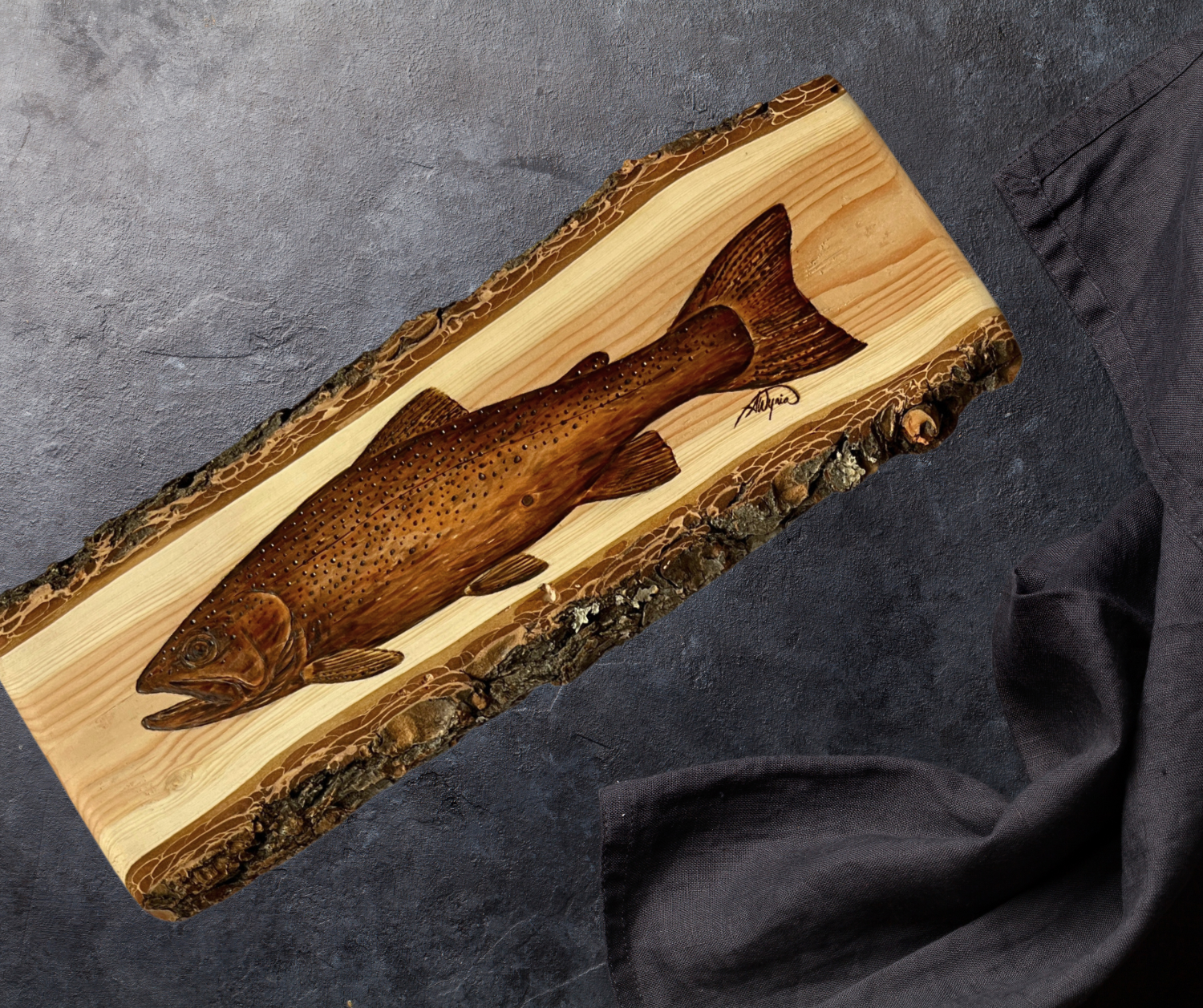 This is an original, one-of-one, hand burned piece by Abby Wynia, featuring a side profile portrait of a rainbow trout. This is one of three pieces completed on a matching set of douglas fir planks.