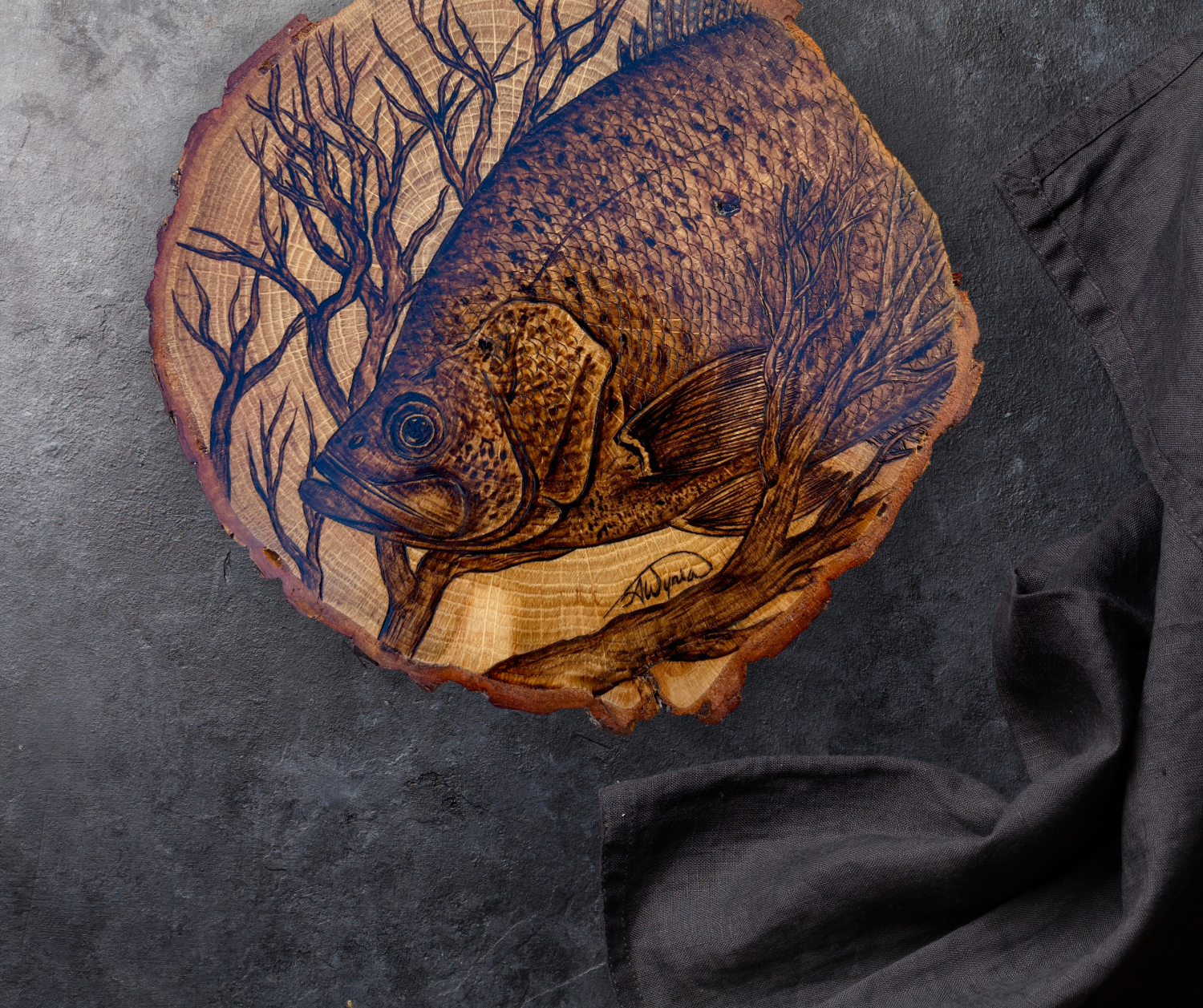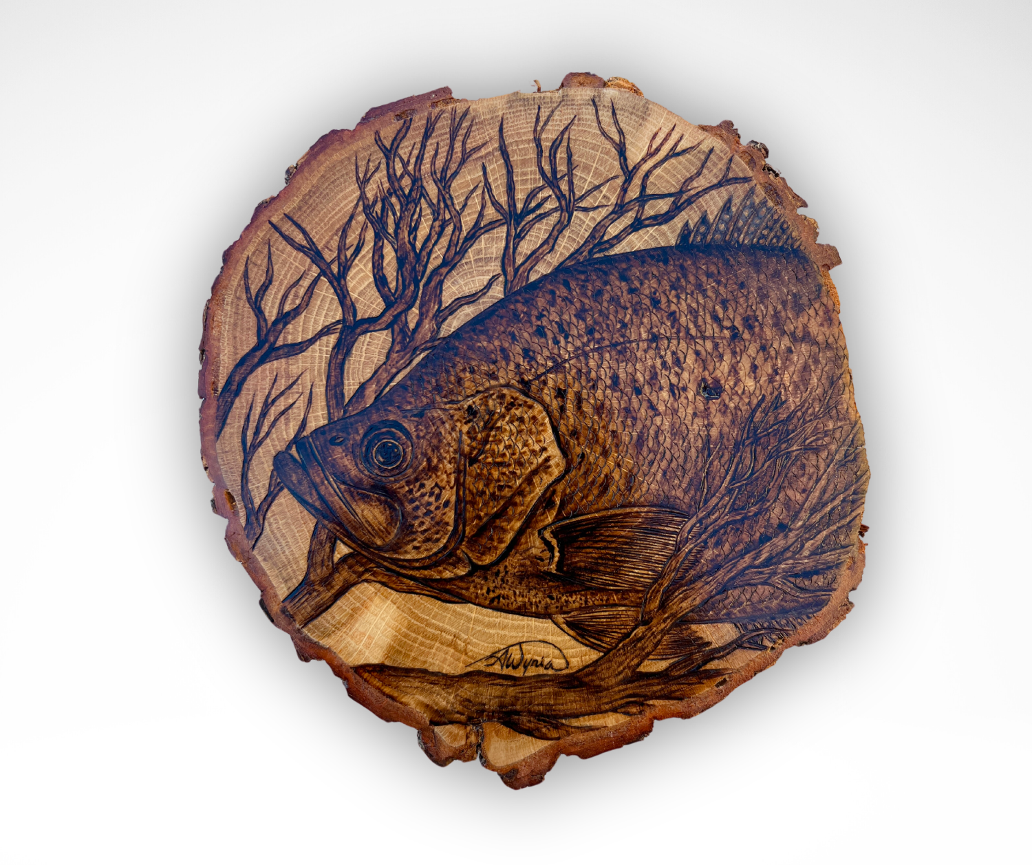 This is an original, one-of-one, hand burned piece by Abby Wynia. The piece features a black crappie hiding amongst the submerged branches of your favourite ice fishing spot.