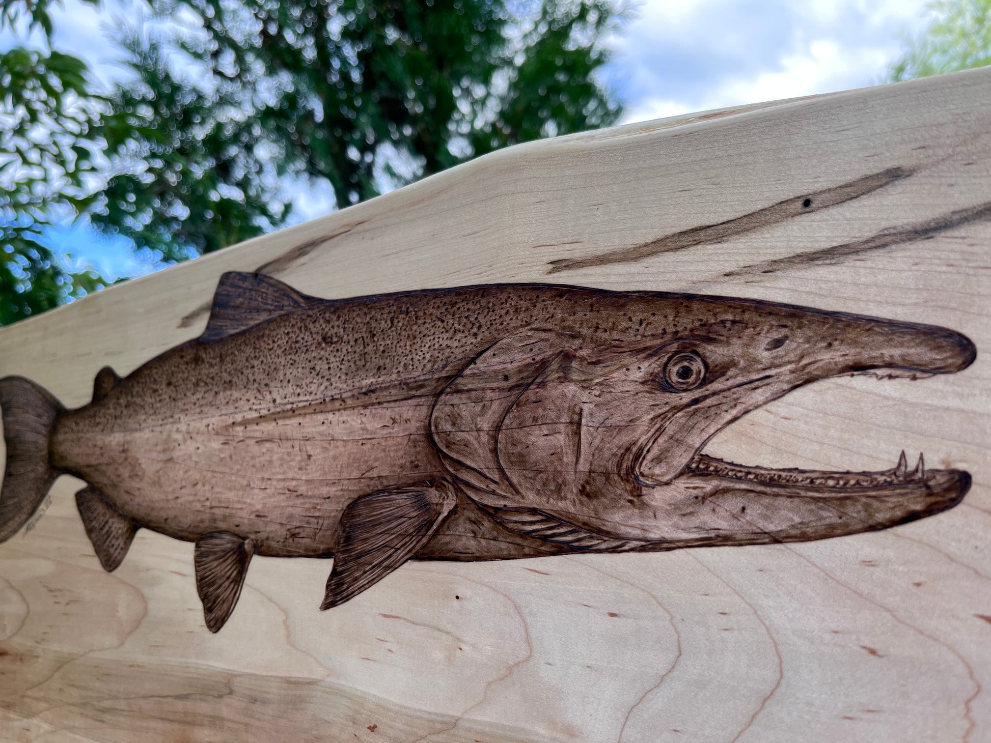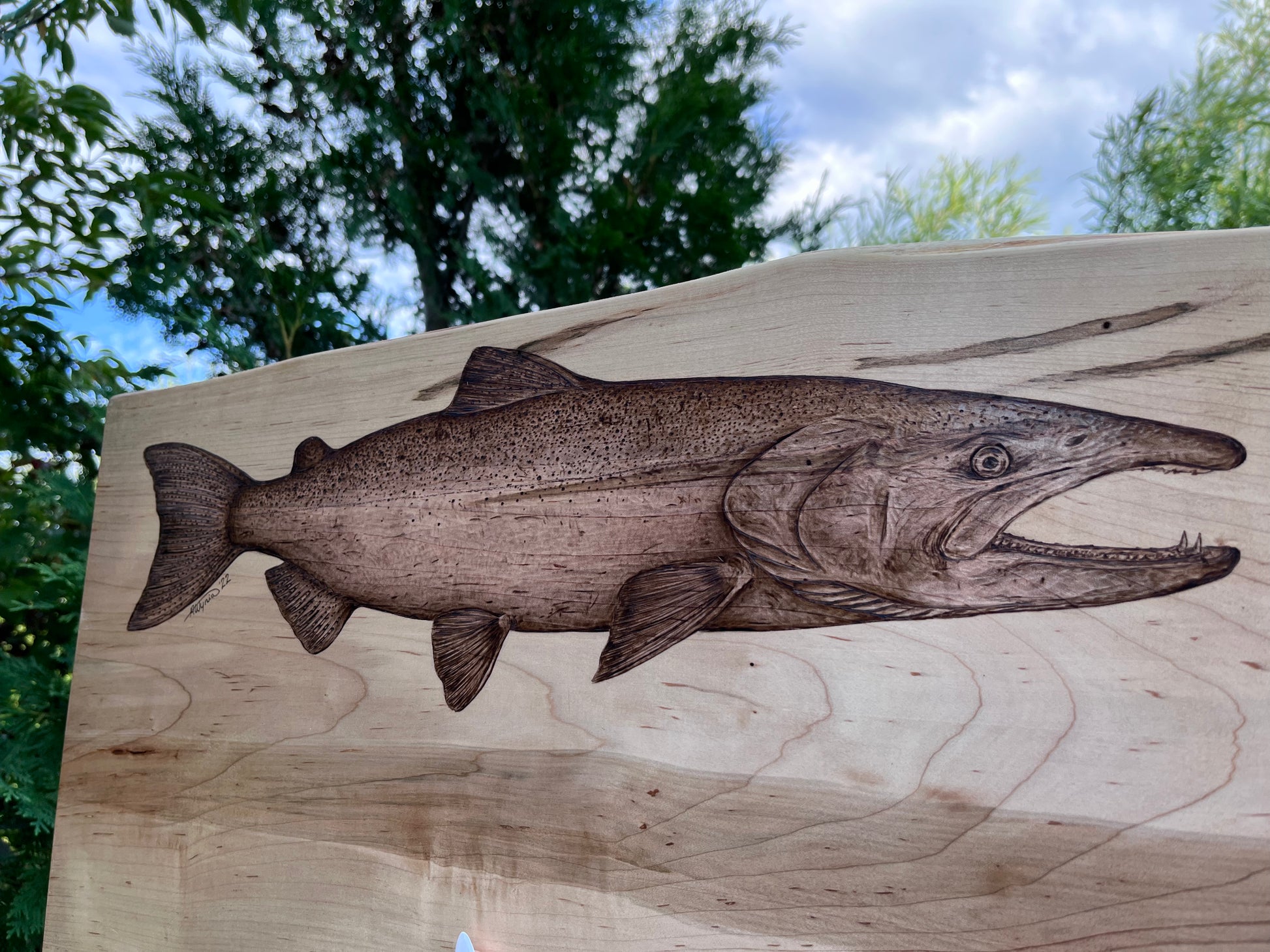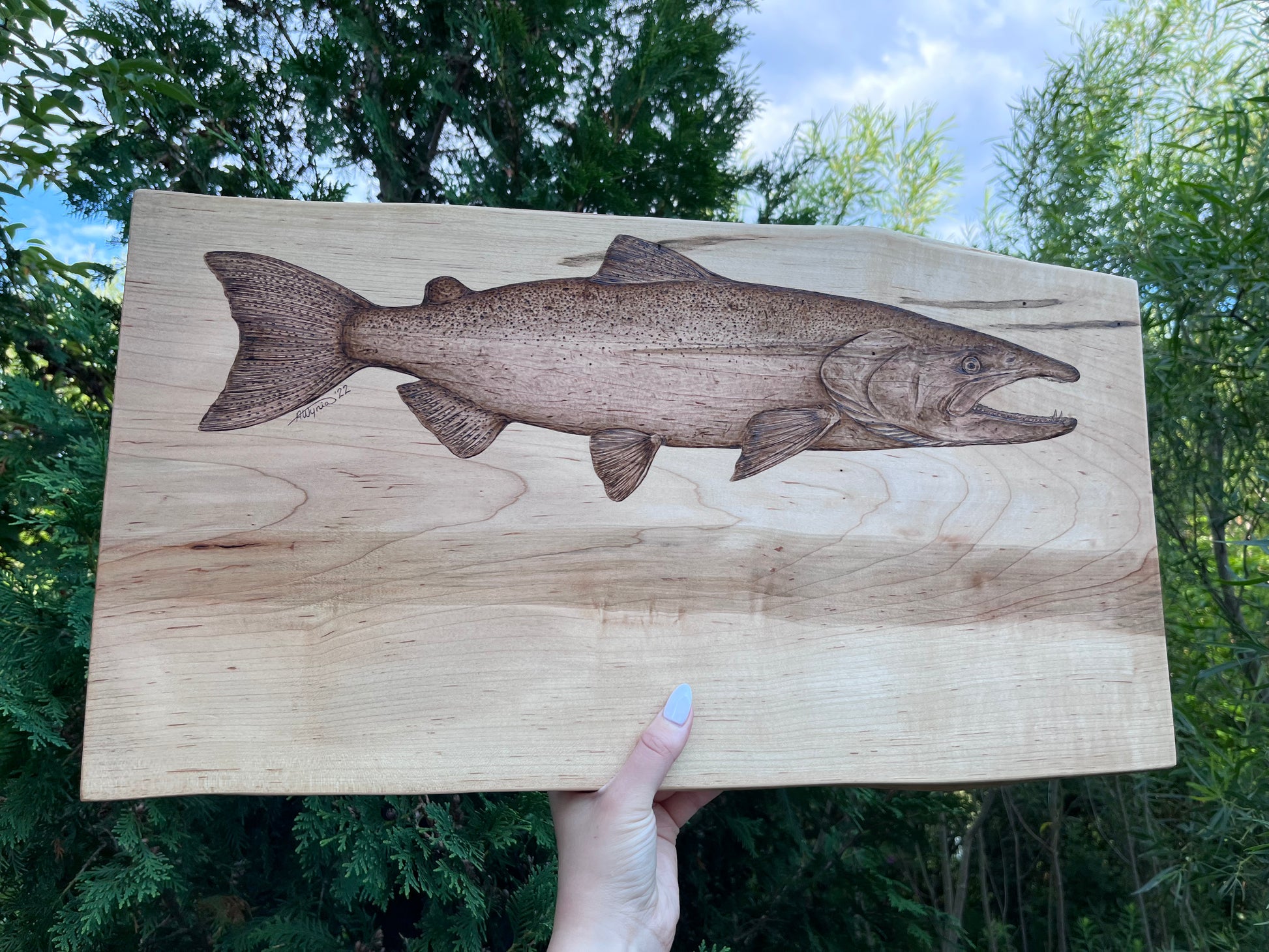 This beautiful handmade live edge wormy maple board features a hand-burned chinook salmon (aka king salmon) top centre, measures approx 22.5” x 12.25” (at widest end) x 1” thick, and has been treated with food-safe tung oil. This board is a one-of-a-kind piece that starts with a sketch and comes to life during the pyrography process as details are teased out. Let this stunning salmon piece steal the show at your next entertaining event, showcasing personality while providing functionality.