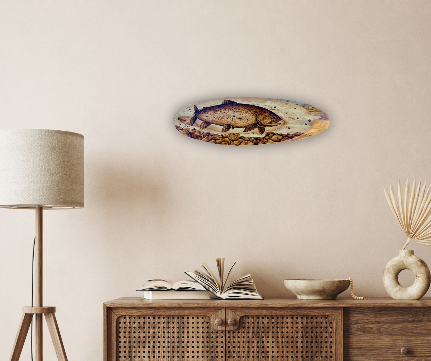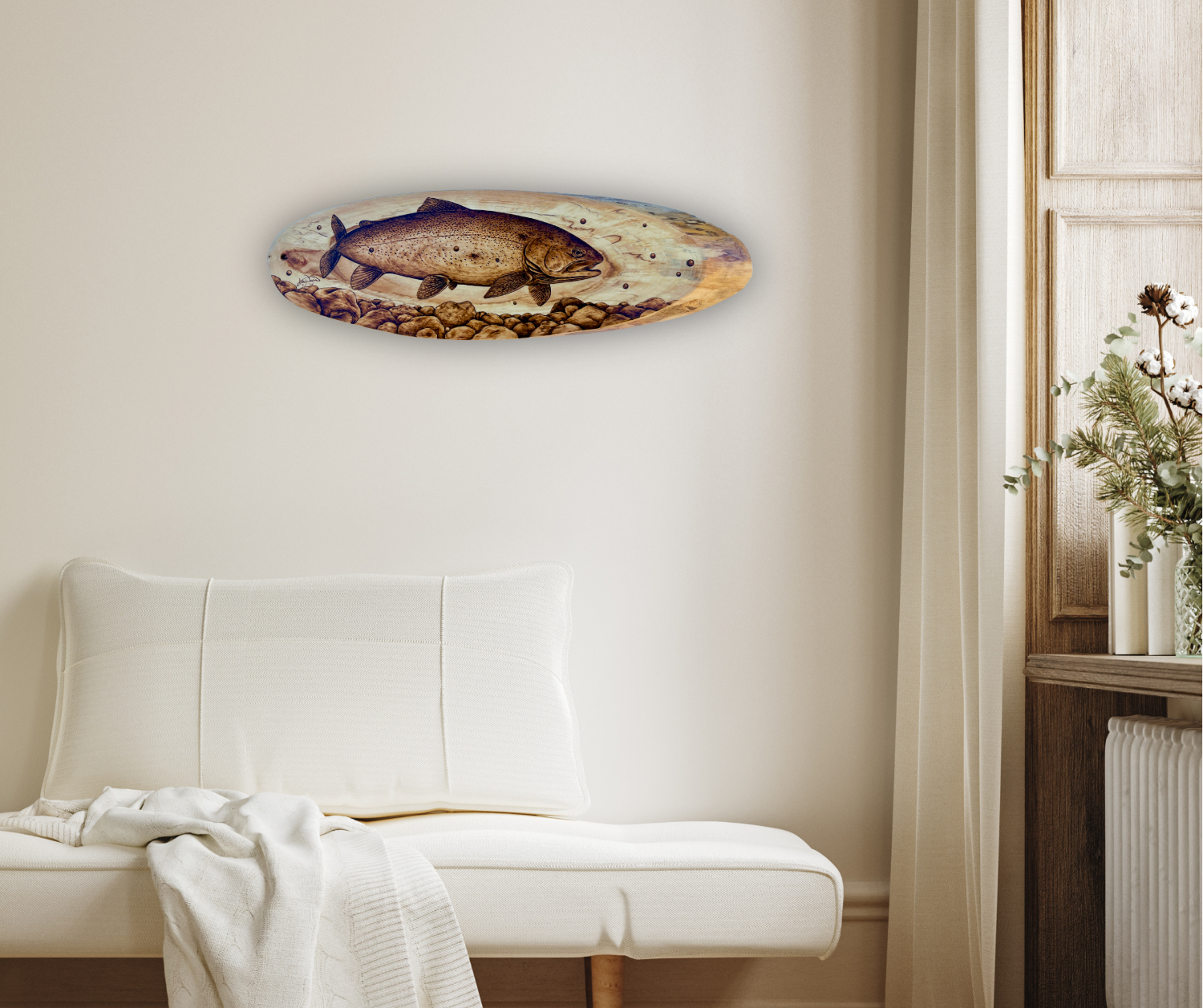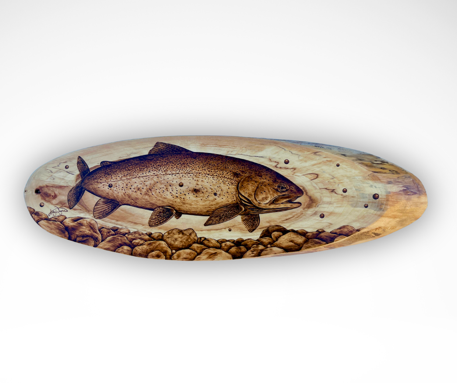 The Next Cohort is an original, one-of-one, hand burned piece by Abby Wynia. The piece features a hen steelhead (or, rainbow trout) tucked close to the bottom substrate among several floating and settled salmonid eggs.