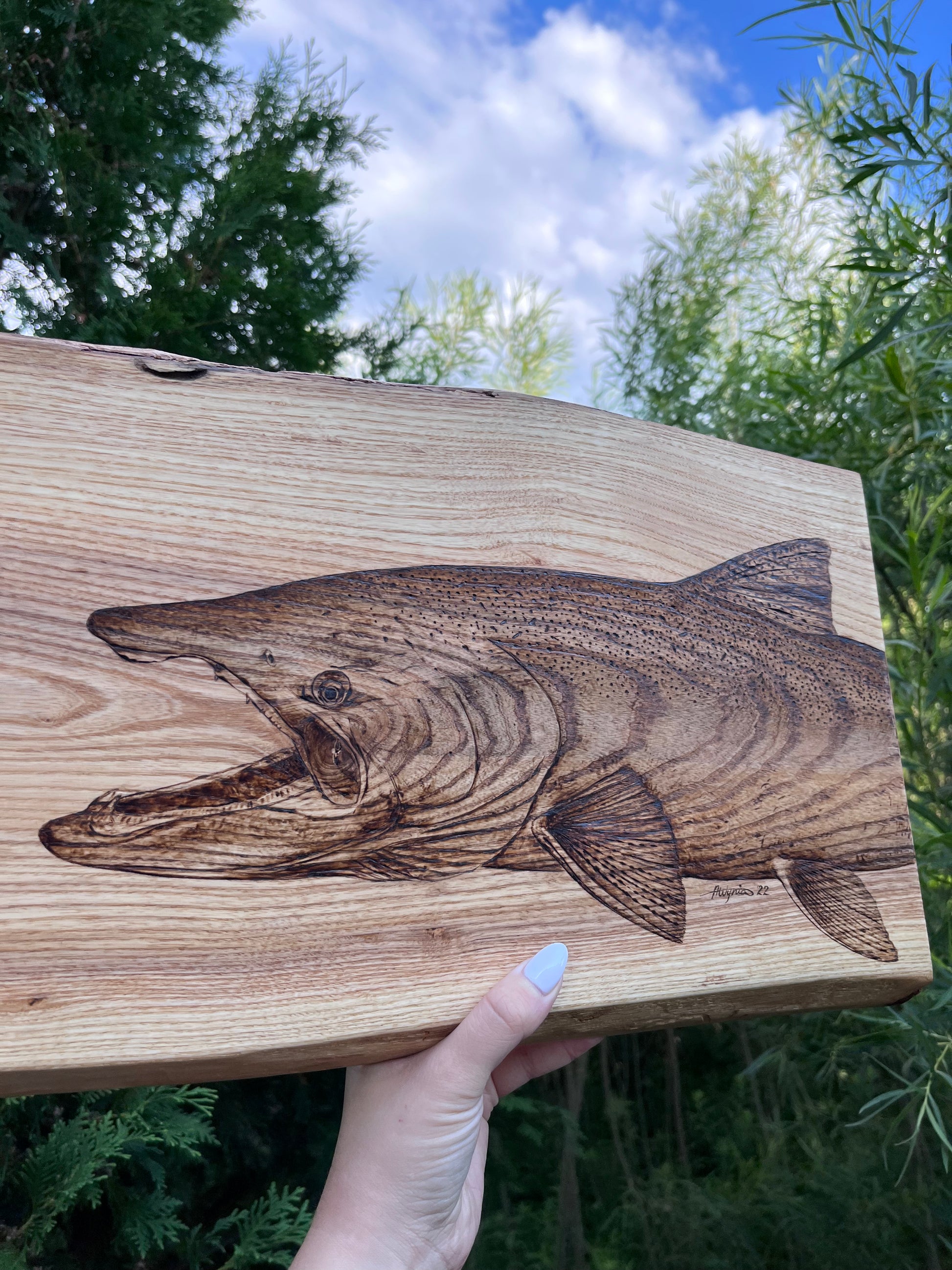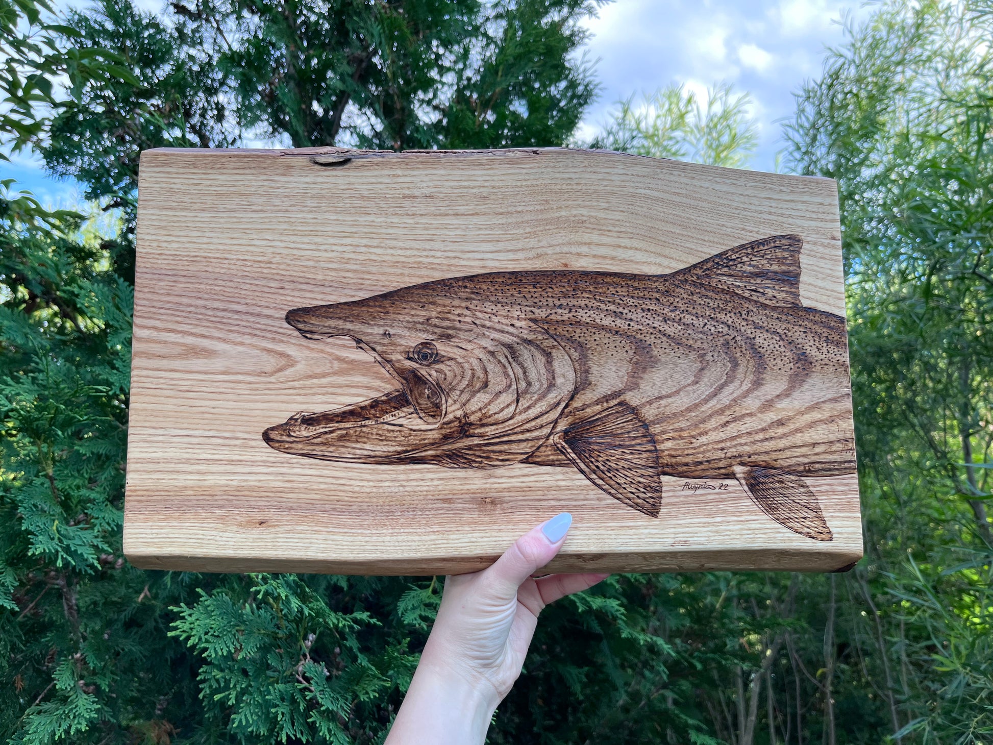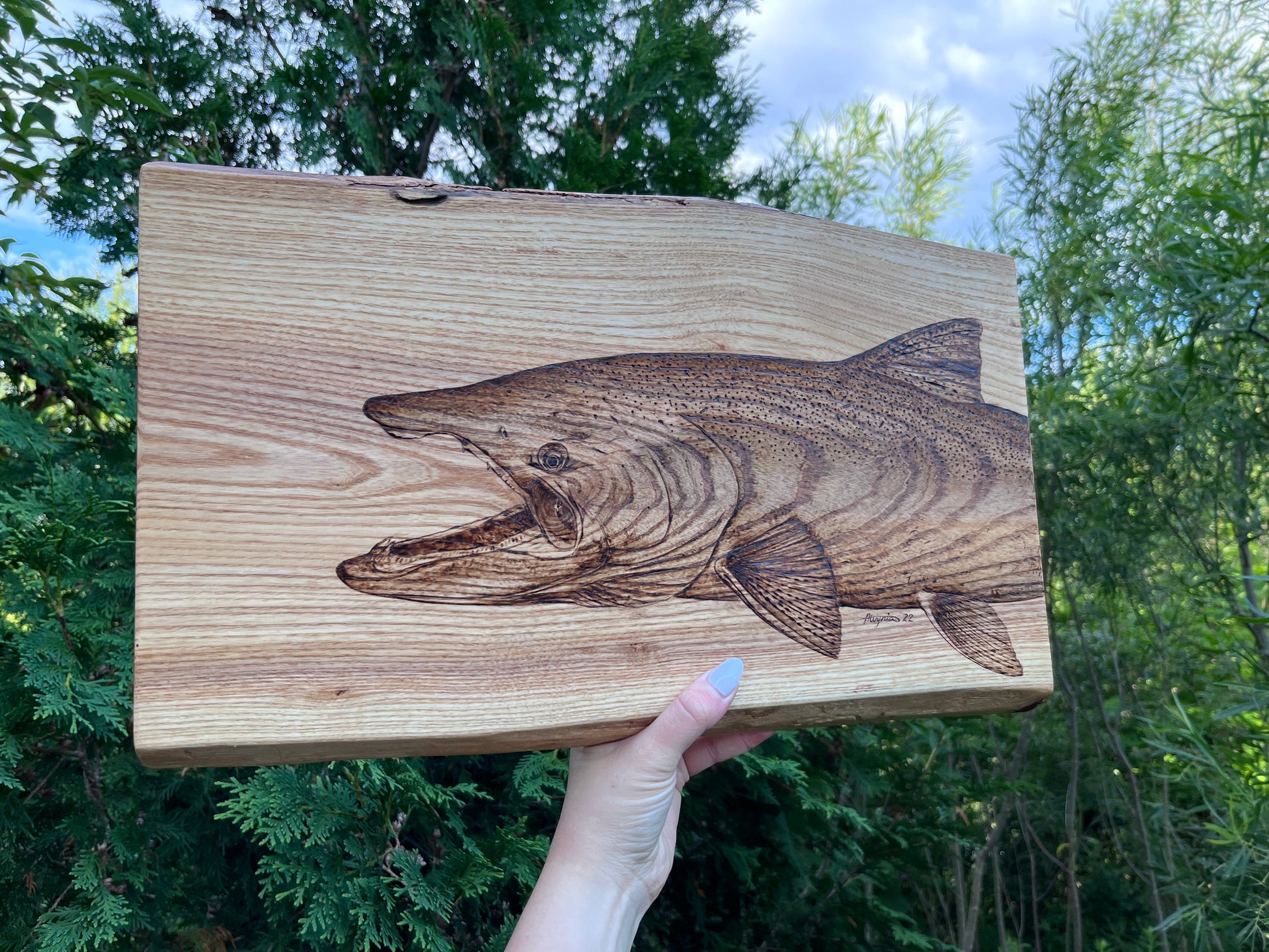 This beautiful handmade live edge ash board features a hand-burned chinook salmon (aka king salmon) top centre, measures approx 18” x 11” (at widest end) x 1” thick, and has been treated with food safe tung oil. This board is a one-of-a-kind piece that starts with a sketch and comes to life during the pyrography process as details are teased out. Let this stunning salmon piece steal the show at your next entertaining event, showcasing personality while providing functionality.