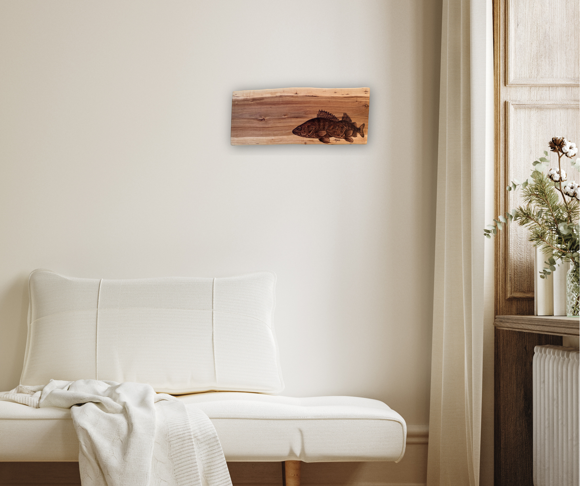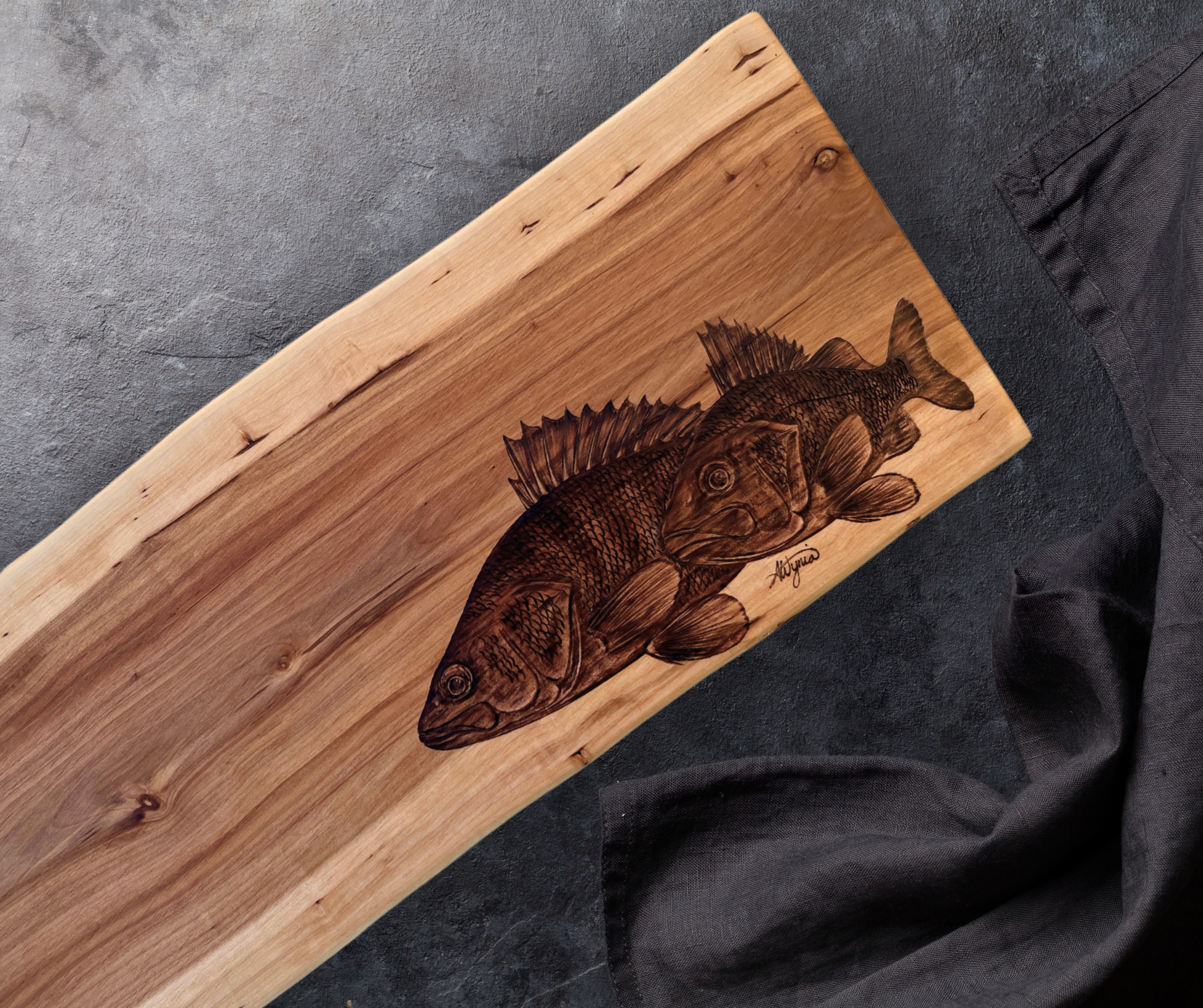 This hand burned piece features two overlapping yellow perch - one a side profile and the other turning toward you - on live edge applewood. The piece has been treated with a food safe mineral oil and beeswax mixture for use as a serving board, or perhaps the addition of hanging hardware to the back of the board would suit your needs for some fish-themed artwork in your kitchen, office, livingroom, etc.
